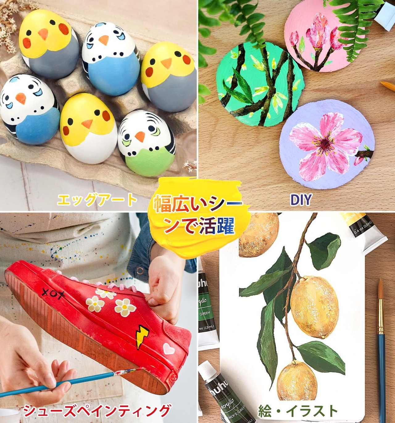 豊富なセット内容:チューブタイプの絵具:1本あたり12ml。ペイントブラシ:6本(形状が違います)。筆が使いやすい、セットが持ち運びしやすいます。家でも学校でも外出先でも便利です。