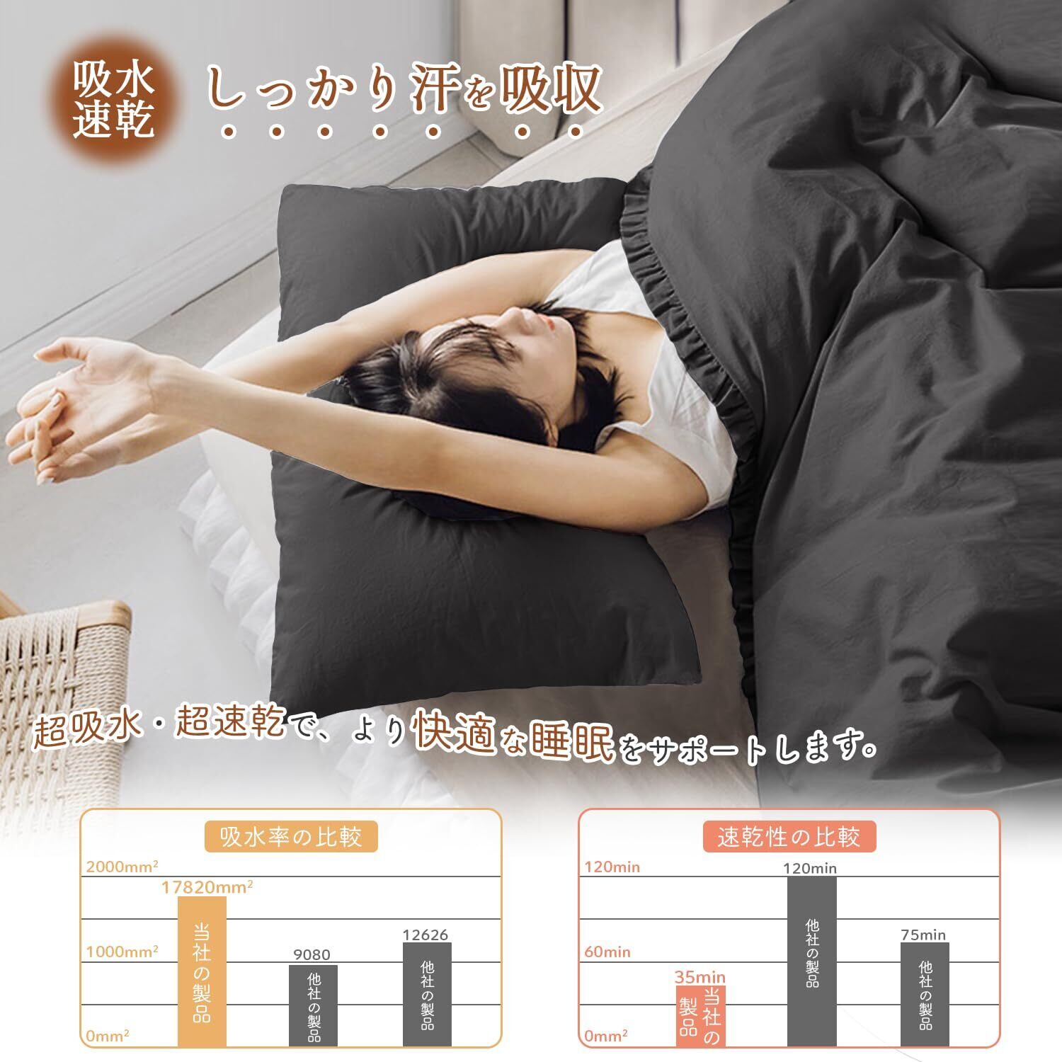 【通気性抜群&蒸れにくい快適設計】枕カバーは直接肌に触れるものだから、通気性の良さが重要。吸湿速乾性に優れた生地を採用し、汗や湿気を素早く吸収・発散。寝汗をかきやすい季節でもさらっと快適に過ごせます。オールシーズン対応で、一年中気持ちの良い寝心地を提供します。