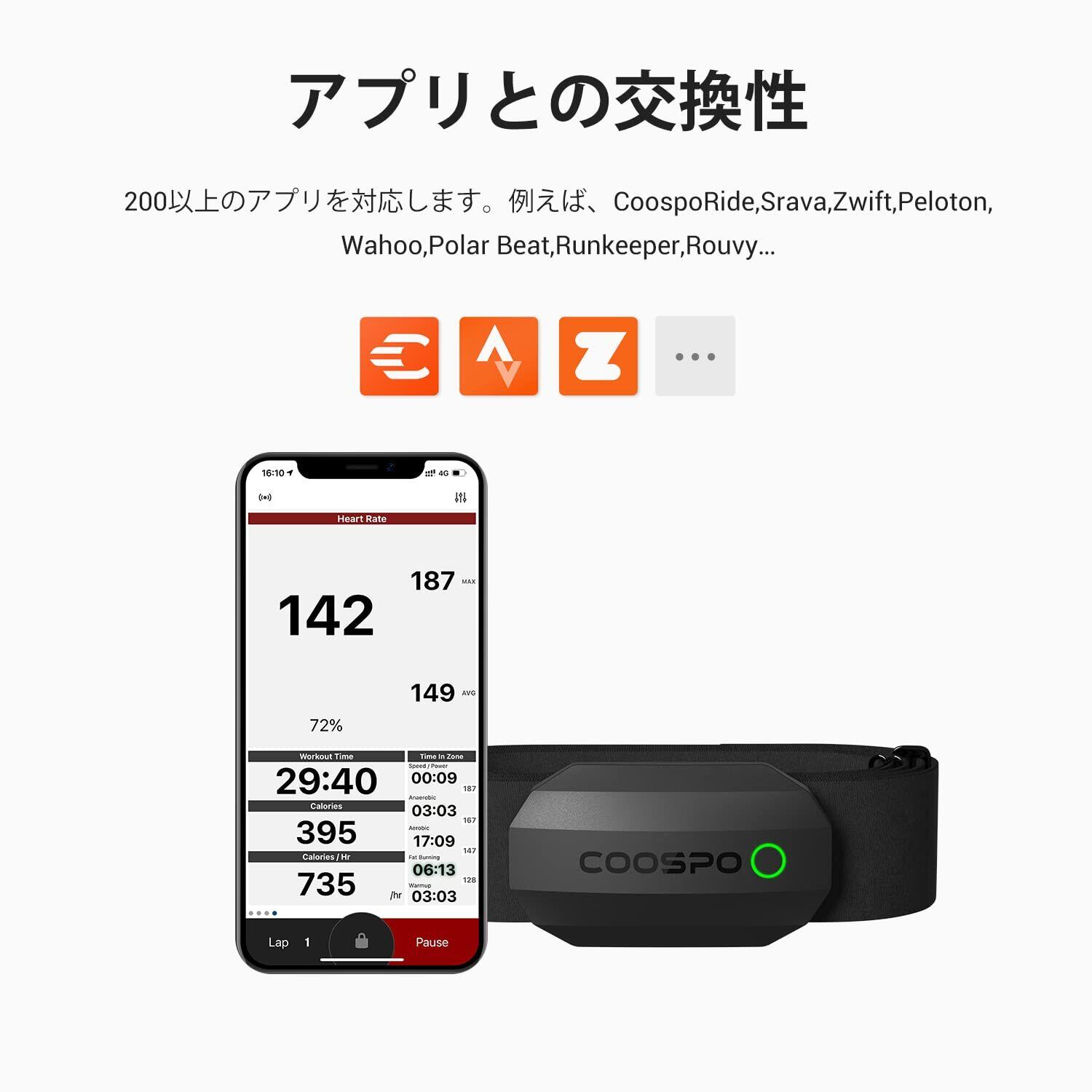 ワイヤレス心拍センサー:H808S心拍センサーでは、ワイヤレスBluetoothとANT+テクノロジー両方搭載しており、それを通じてスマホ、サイクルコンピュータなどにペアリングできます。スポーツアプリWahoo Fitness、RunKeeper、MapMyRun、Entdomont、Sprots Trackerなどにサポートです。