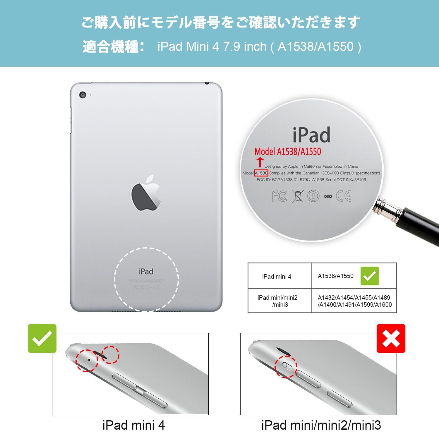 対応機種: 7.9" Apple iPad Mini 4世代 2015 (A1538 A1550 A1546)、その他の型式に適用されません。ご購入前に型番をご確認いただきます。