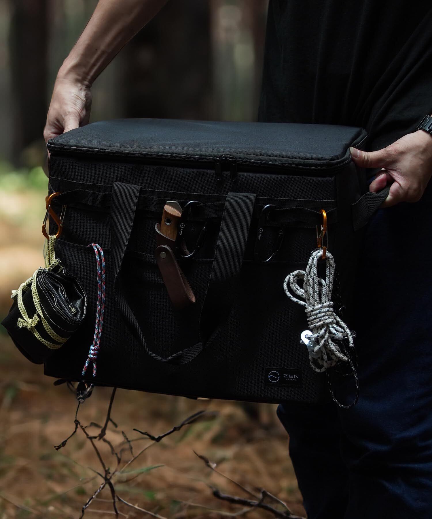ソフトコンテナのカラビナループを活用することでガイロープを吊るすなどさらに多くのギアをコンテナで持ち運ぶことが可能です。