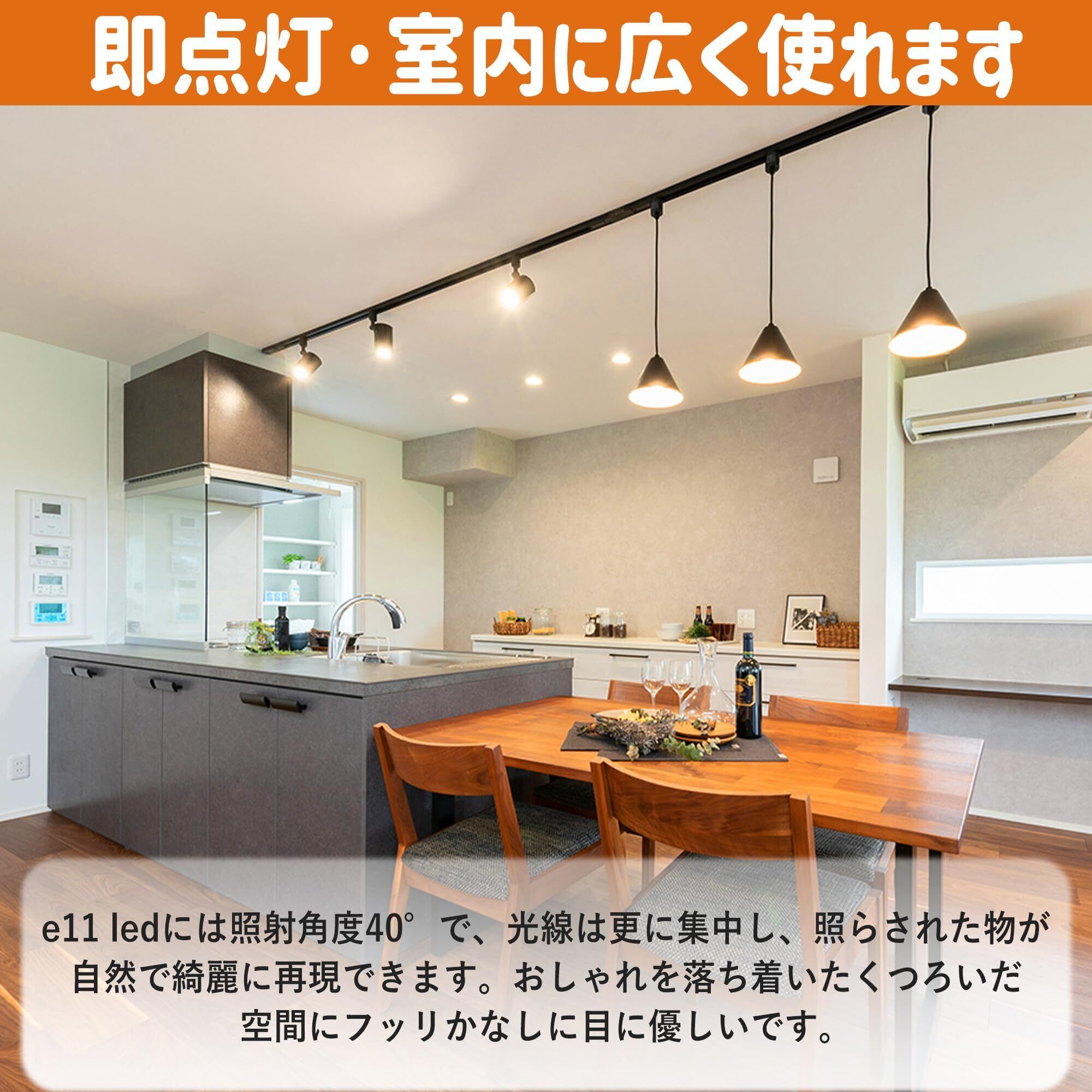 商品仕様:E11 led 電球、寸法:全長約63mm、最大径約50mm、演色指数(CRI):90RA、消費電力:6W=60W形相当、全光束:650LM、色温度:2700K(電球色)、口金:E11、ビーム角度:40°、調光器対応、定格寿命:25000H、パッケージ:4個。