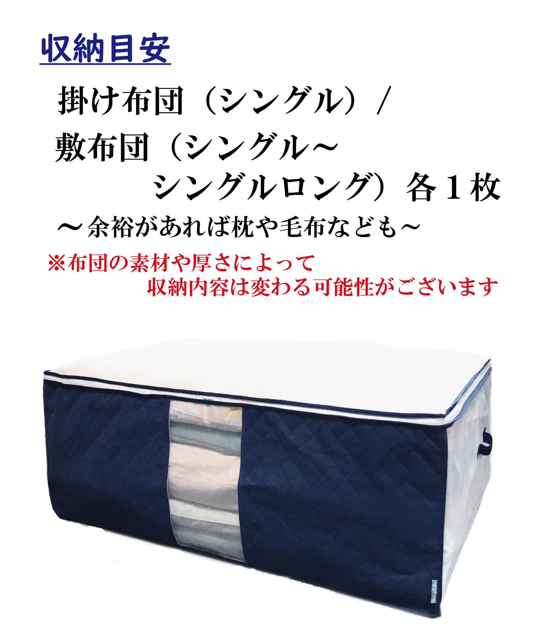 ※持ち手部分にかなり重さがかかりますので取り扱いにご注意ください(持ち手部分は二重縫製加工済)/通気性を重視し厚紙などは入っておりませんので、収納物が入っていない場合は自立しません(使用しない時はコンパクトに畳めます)/収納する寝具の厚みなどにより収納目安は変わります。ご了承くださいませ。