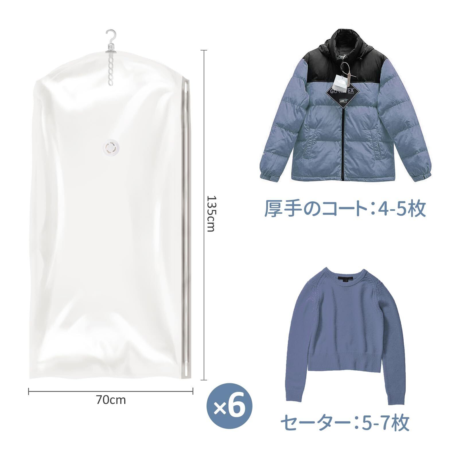 圧縮袋 吊るせる衣類圧縮袋 135 x 70cm 6枚入 吊り下げ 真空バッグ カビ ダニ対策 防塵 防湿 着物収納 コート 洋服 ジャケット スーツ用 大容量 360度回転 掃除機対応 省スペース 引越し 衣替え 旅行用 透明