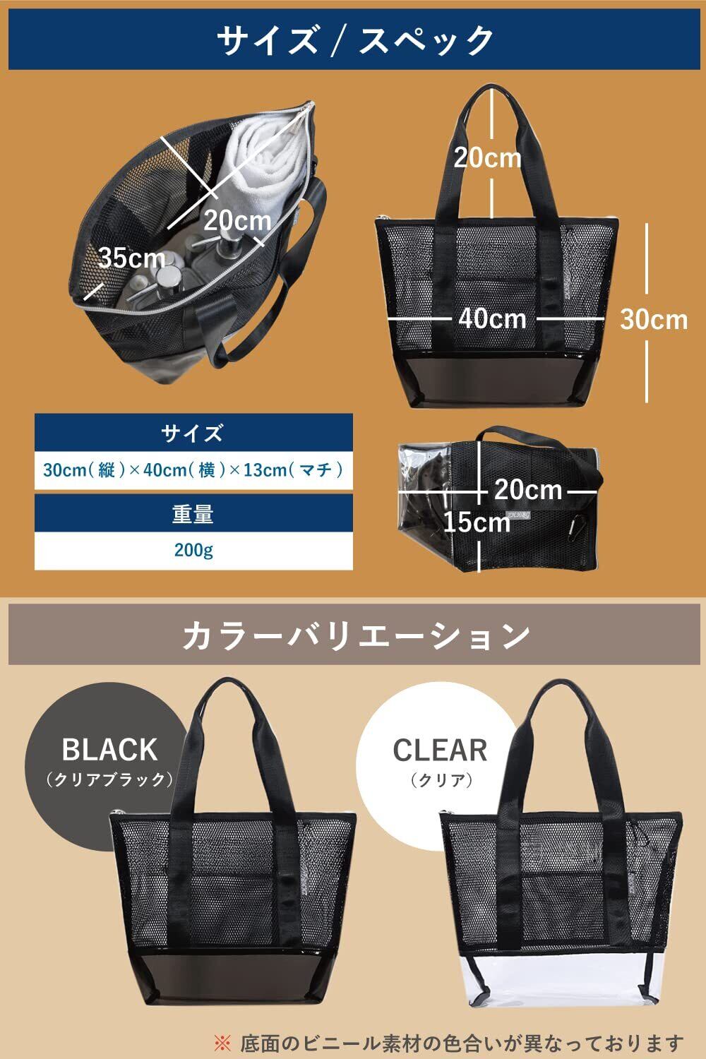 中身が汚れない防水生地:バッグの底面には防水性のビニール素材を使用しているため、濡れたものを入れても水が滴り落ちることがありません。また、お風呂場やプールなど、濡れやすい場所でも中身が汚れる心配もありません。