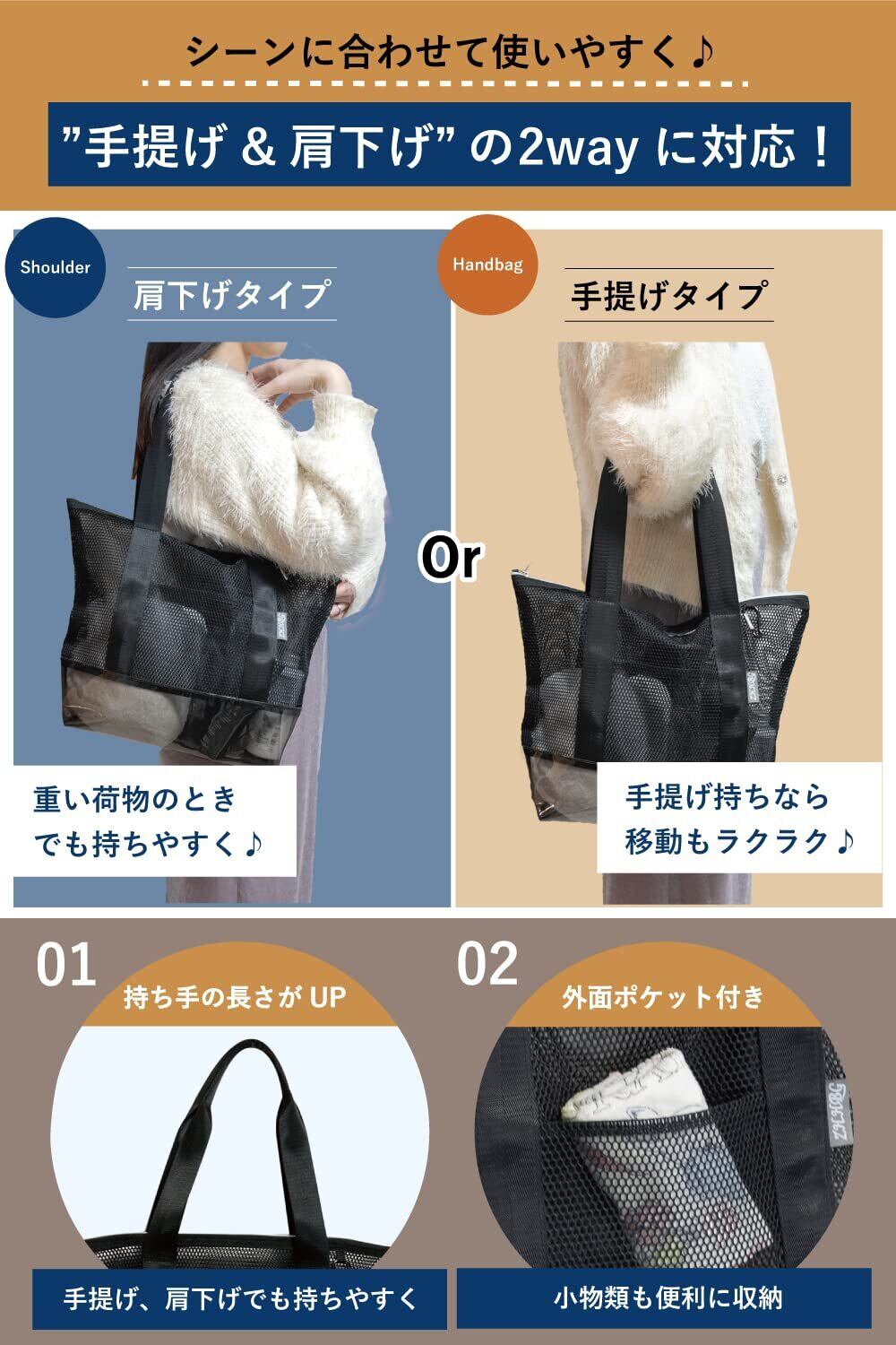 ラクラク運べる2wayバッグ:手提げバッグとしても肩掛けバッグとしても、どちらの持ち方にも対応できる2way仕様のバッグです。水を吸収し重くなった荷物があるときでも使いやすいバッグです。