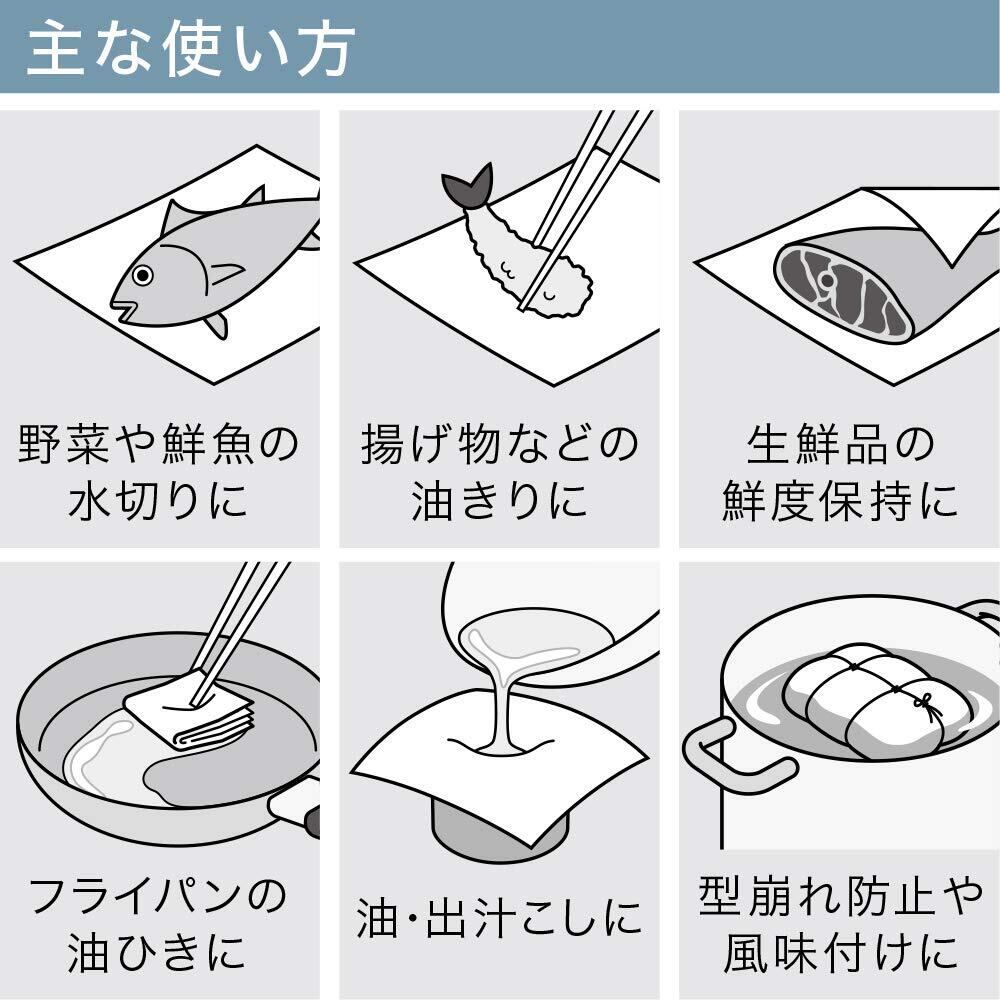 二層構造Hシートにより、水・油・ドリップをたっぷり吸収する不繊維タイプのクッキングペーパー。天然パルプ使用。