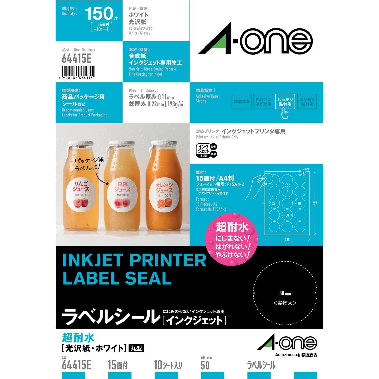 エーワン ラベルシール インクジェット 超耐水 光沢紙 15面丸型 10シート 64415E