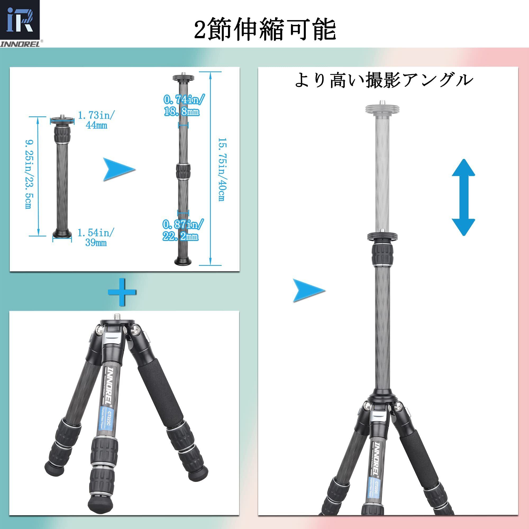 【2022最新】INNOREL 三脚センターポール 汎用性 延長ポール 22.2㎜パイプ径 2節伸縮 三脚アクセサリー カーボン 三脚一脚用 1/4”3/8”ネジサイズ ER222C