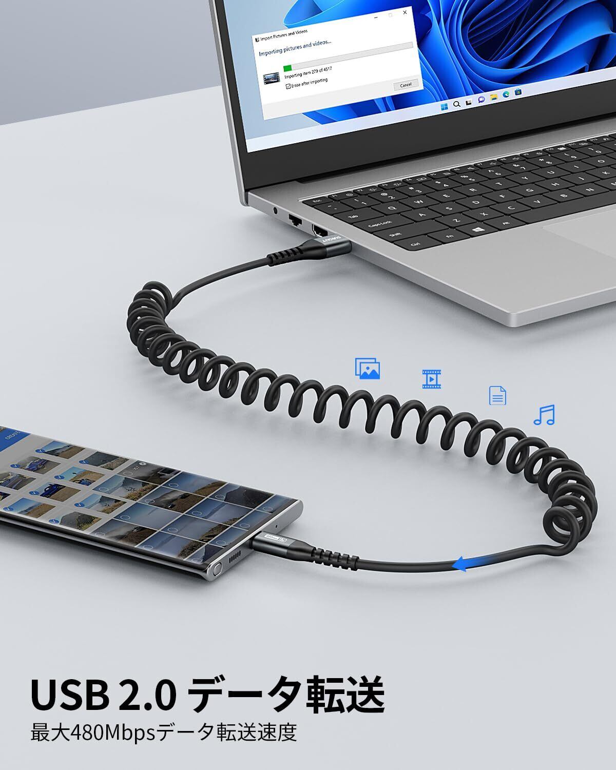 【コイル形状で使いやすい】コイルケーブルのデザインで、ケーブルを整理整頓でき、持ち運びや保管も簡単です。伸び縮み可能で、使い勝手抜群です。