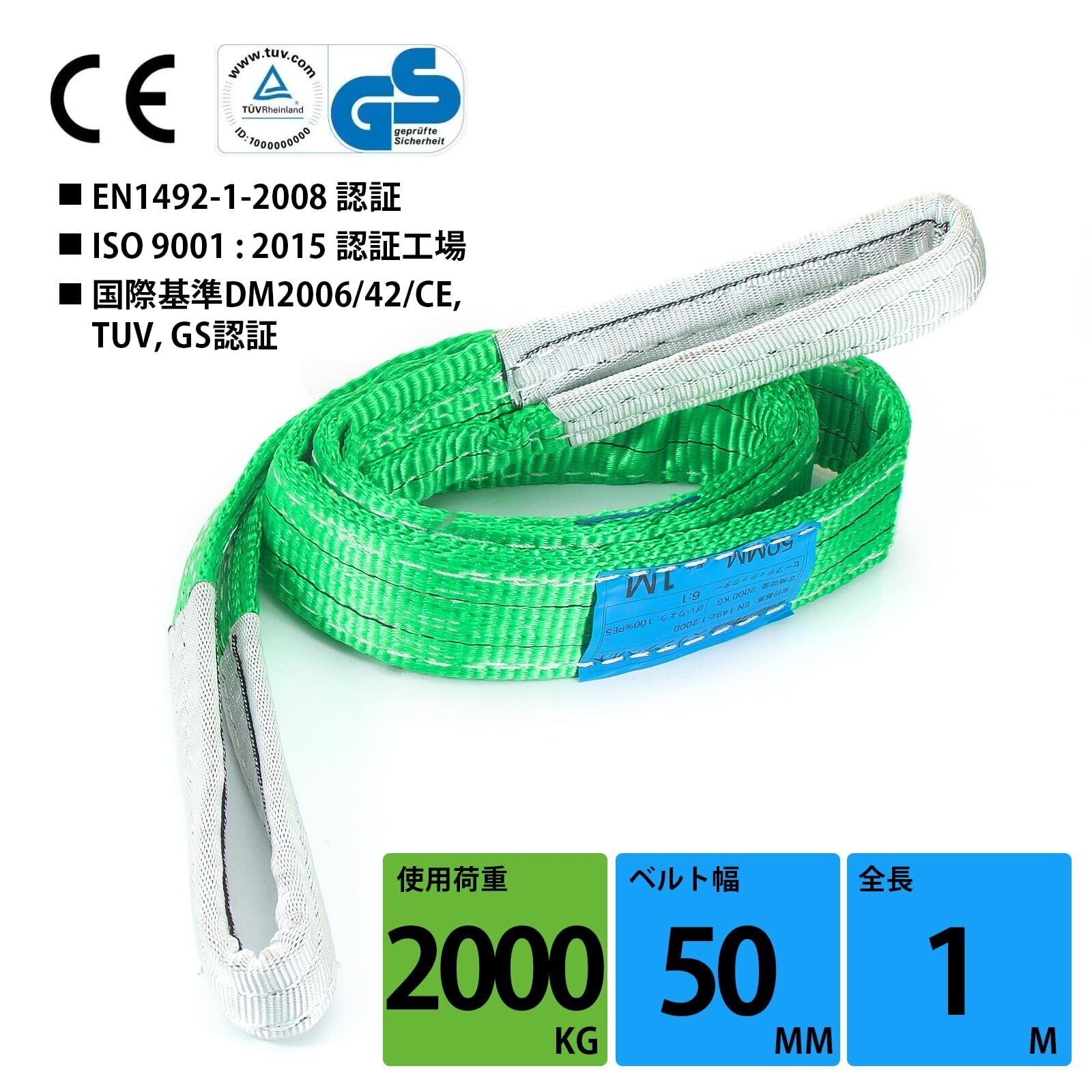 【商品仕様】■全長:1M ■ベルト幅:50mm ■緑 最大使用荷重:2000kg (ストレート吊の場合) ■安全係数:6