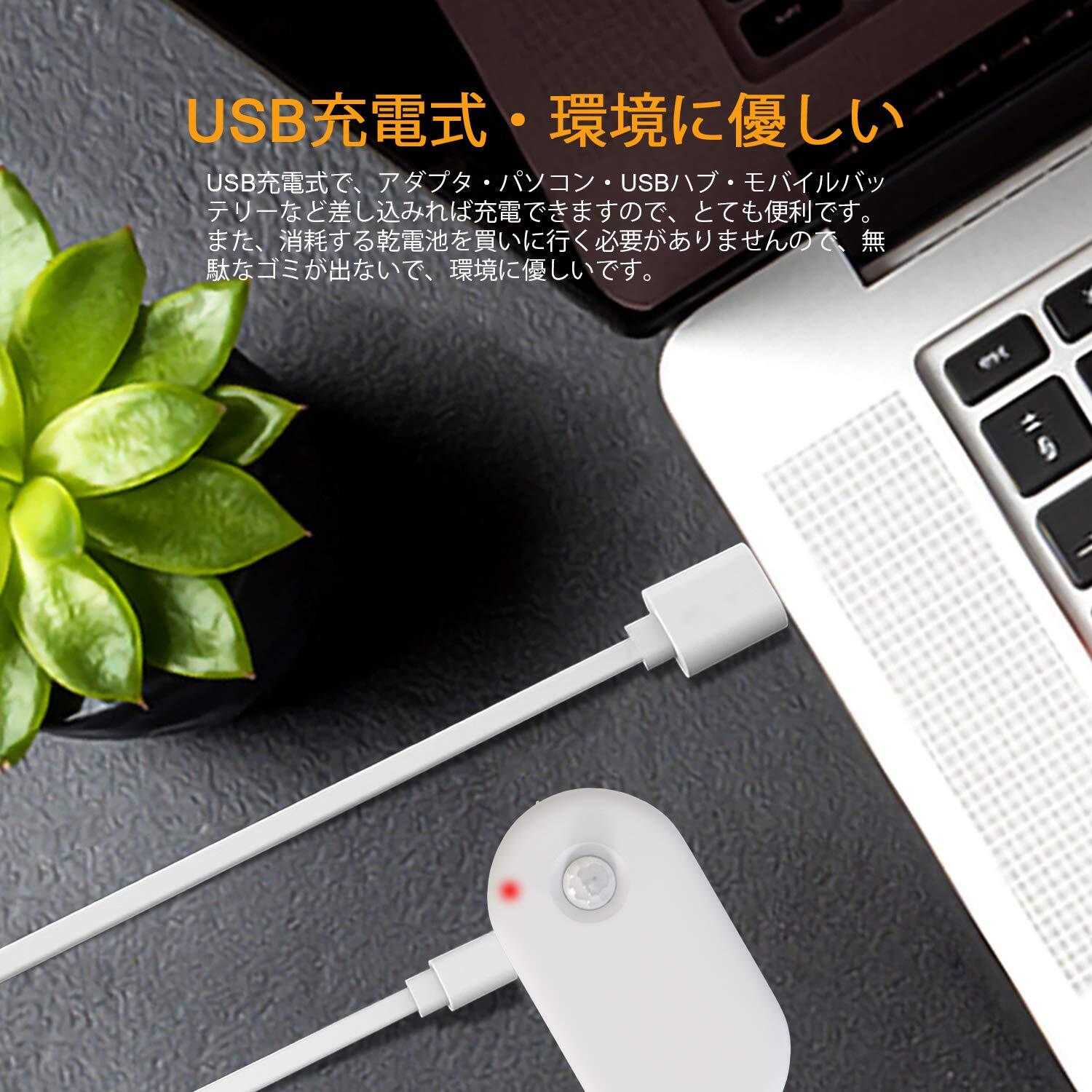 【USB充電可能】USB充電タイプで、乾電池を頻繁に買う必要がありません。また、コードレスでクローゼット・物置・玄関等コンセントの無い場所でも手軽に使えます。本製品はコンパクトで軽量の設計で、持ち運びが便利で、緊急時(災害など)に、鉄片から外して、非常灯と手持ち用ハンドライトとして利用できます。※ご注意:写真は点灯する状態を掲載されていますので、カバーはオレンジに現れますが、実物のカバーは白いです。