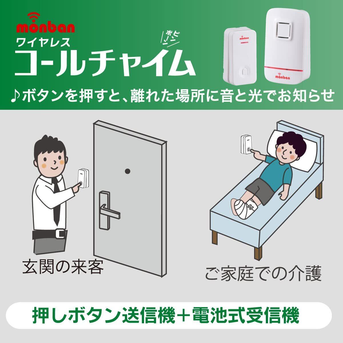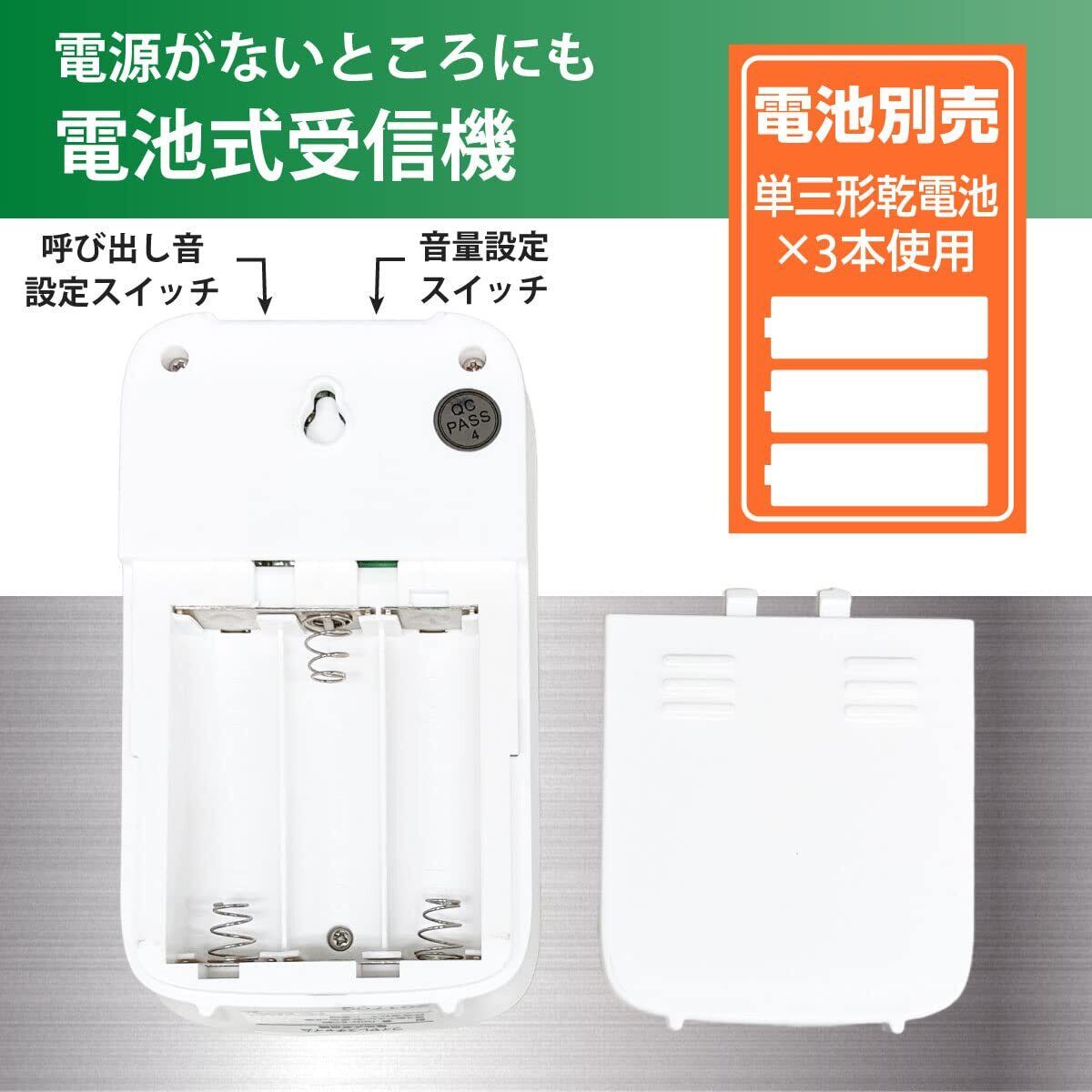 電池式受信機、■ 動作距離(約):80m(直線見通し・遮蔽物の無い環境)、■ 設置場所:室内、■ 呼び出し音:32種類、■ 電源:単3形乾電池×3本、■ 電池寿命:1日10回使用で約3ヶ月、■ 音量(1m):最大 85dB(4段階音量調整)、■ 使用温度範囲:0℃~40℃、