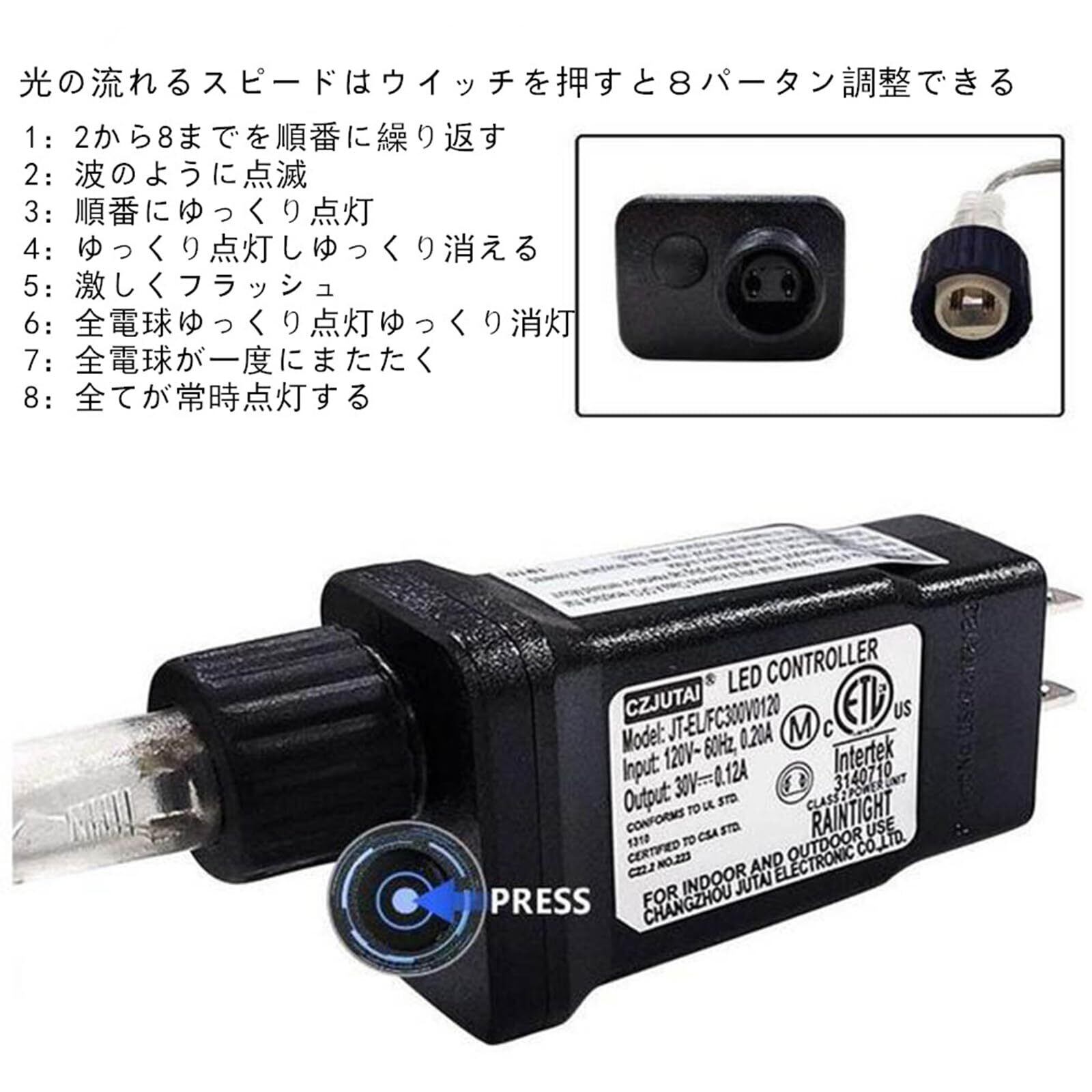 【屋外防水・取付簡単】LEDイルミネーションライトはIP44生活防水仕様で、水に濡れても心配することがないです!コンセントに付属の31V 0.2A 給電器で差し込むだけで、明るく美しいLEDが発光します。消費電力は従来の電球に比べても低く、一般的なイルミネーションに比べて柔らかい幻想的なカラーが大変人気です。使用場合:ご家庭やお店、広場やパーティ会場を綺麗に彩ります。クリスマス、ガーデン、結婚式、パーティー、キャンプ、ハロウィン、ホテル、バー、店舗、寝室、玄関、庭、壁、舞台、学校、ショッピングモール、披露宴ツリーなどの装飾としては大活躍です。ご注意:付属の31V 0.2A給電器は防水ではありません。低電圧31Vの安心な設計で過熱を心配する必要がありません。日本の電気用品安全法(PSE)の技術基準に適合した安全性の高い商品です。