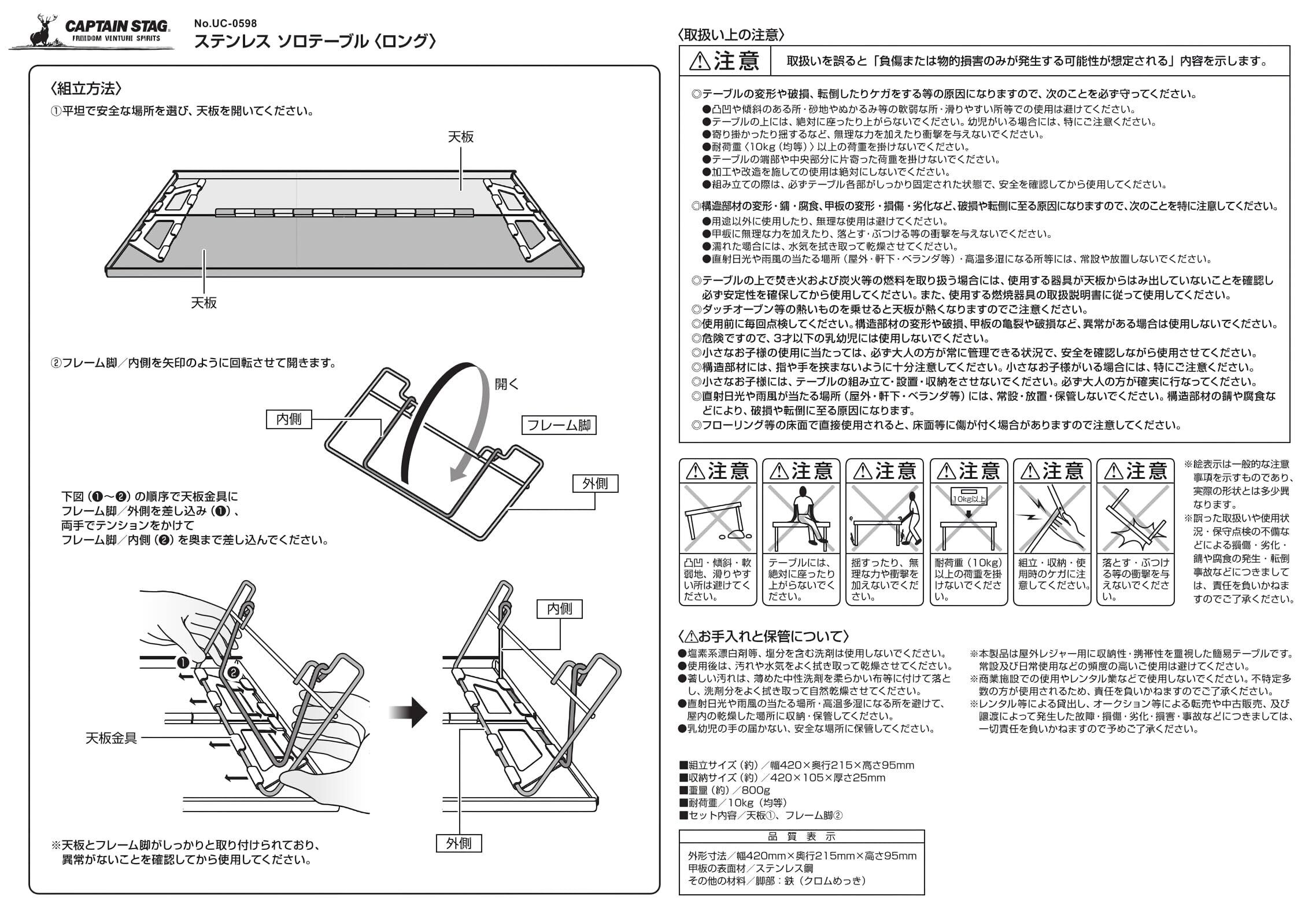 セット内容:天板1、フレーム脚2、材質:甲板の表面材/ステンレス鋼、その他の材料/脚部=鉄(クロムめっき)、原産国:中国