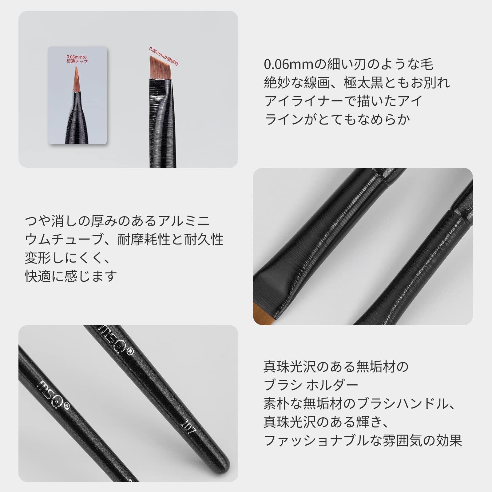 【極細刃ブラシ】 MSQ 2アイライナーブラシとアイブロウブラシの組み合わせで、アイライナーと併用すると、とてもなめらかで細かく描きやすいアイラインが描けます。 0.06mmの極細ブラシヘッドは、アイライナーや眉の形、アイラインの内外を自然に描き、輪郭を描きやすい。 とてもお得なメイクブラシセットです。