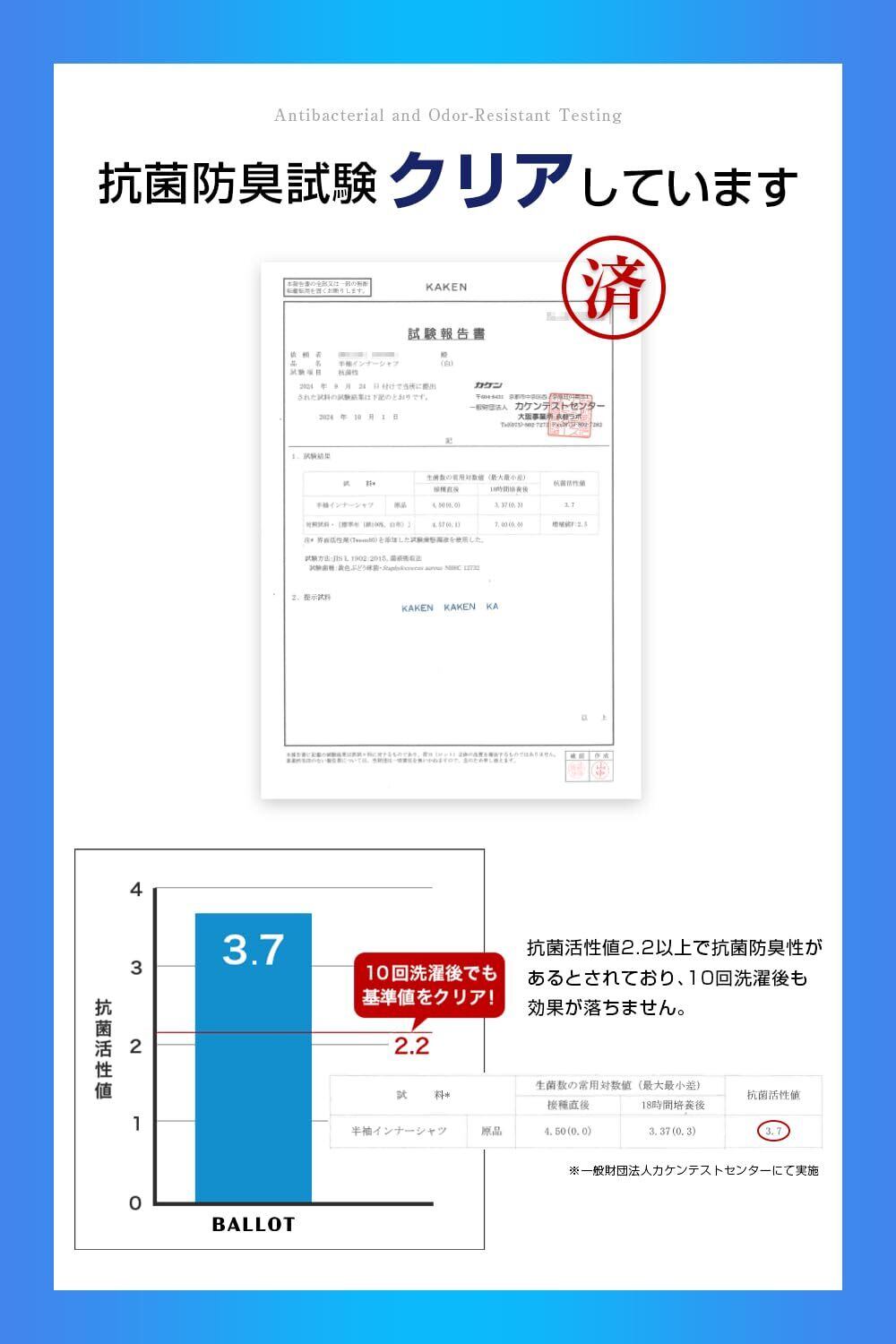 【速乾&防臭】肌に直接触れるインナーだからこそ、速乾性と防臭性にとことんこだわりました。① DEO:脇部分に速乾性の高い生地を使用し、湿気がこもりにくい設計。サラッと快適な着心地を保ち、臭いが気になりません。② DRY:部屋干しの嫌なニオイの原因となる「乾きづらさ」を解消。速乾性に優れた素材で、洗濯後の部屋干し臭を防ぎます。③ DEO:防臭効果のある特別な生地を採用。湿度や体温によって発生するこもり体臭もしっかりブロックし、一日中清潔感をキープします。