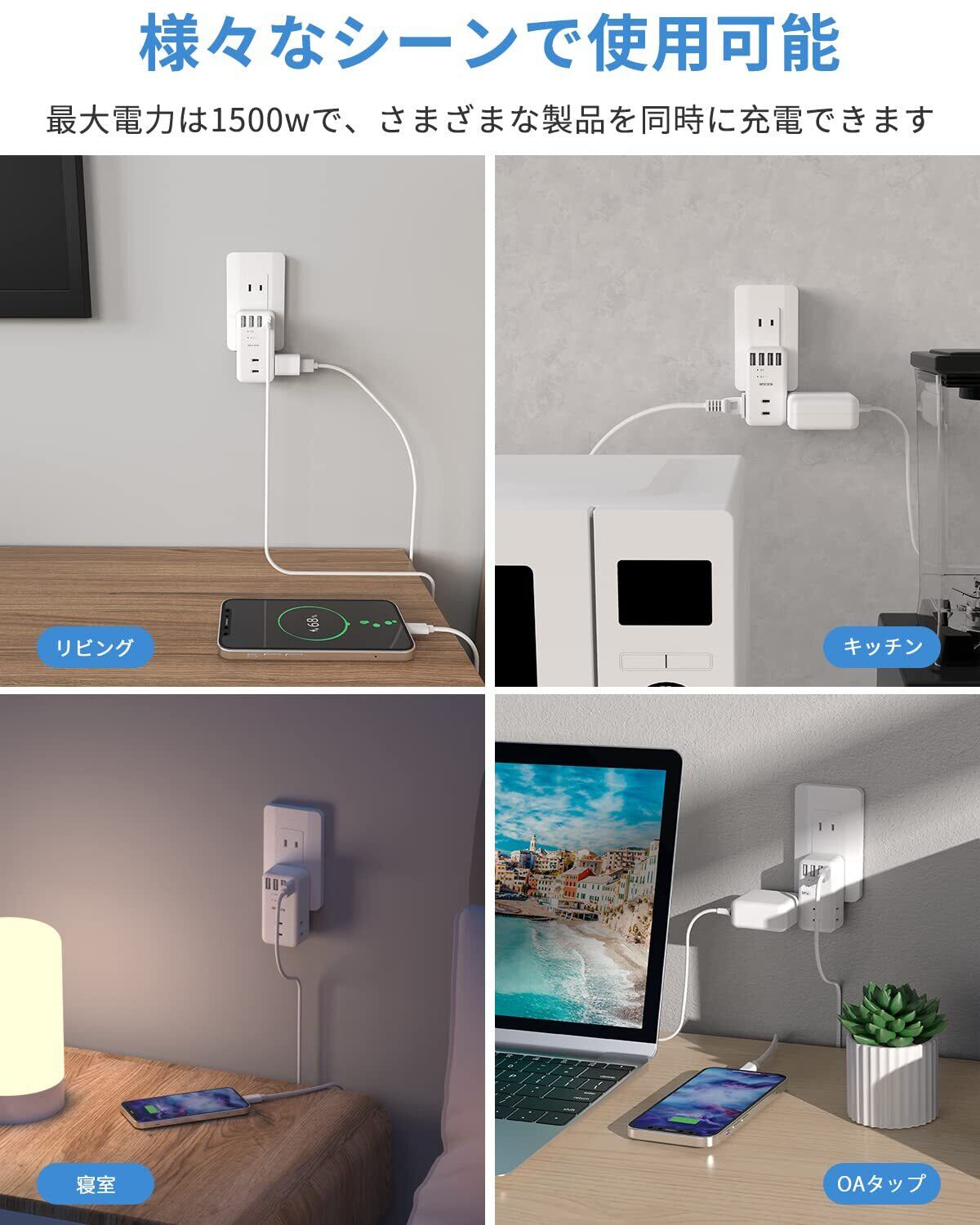 「1台7役・コンセントタップ」4つのUSB-Aポートと3つのAC差込口を搭載したマルチタップです。また、ACコンセントを3方向に分配して、小型ACアダプタを同時に挿入しても干渉せず、配線がすっきりしています。