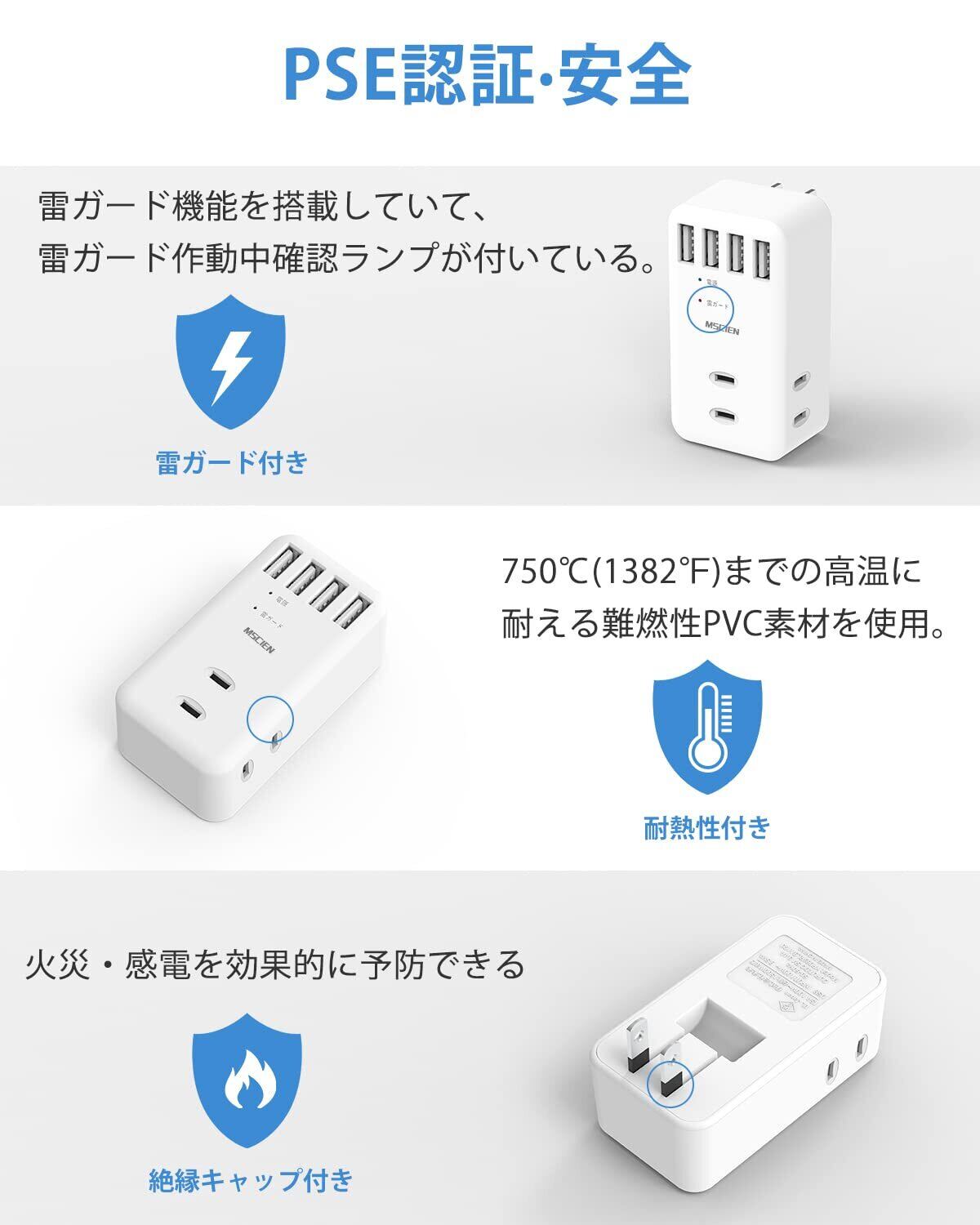 「安全なusb充電タップ」電気火災を有効に予防するため、タップ本体は耐熱性に優れた合成樹脂PC(750°C耐熱)を使用しています。プラグには絶縁キャップが付いており、トラッキング火災の予防に役立ちます。