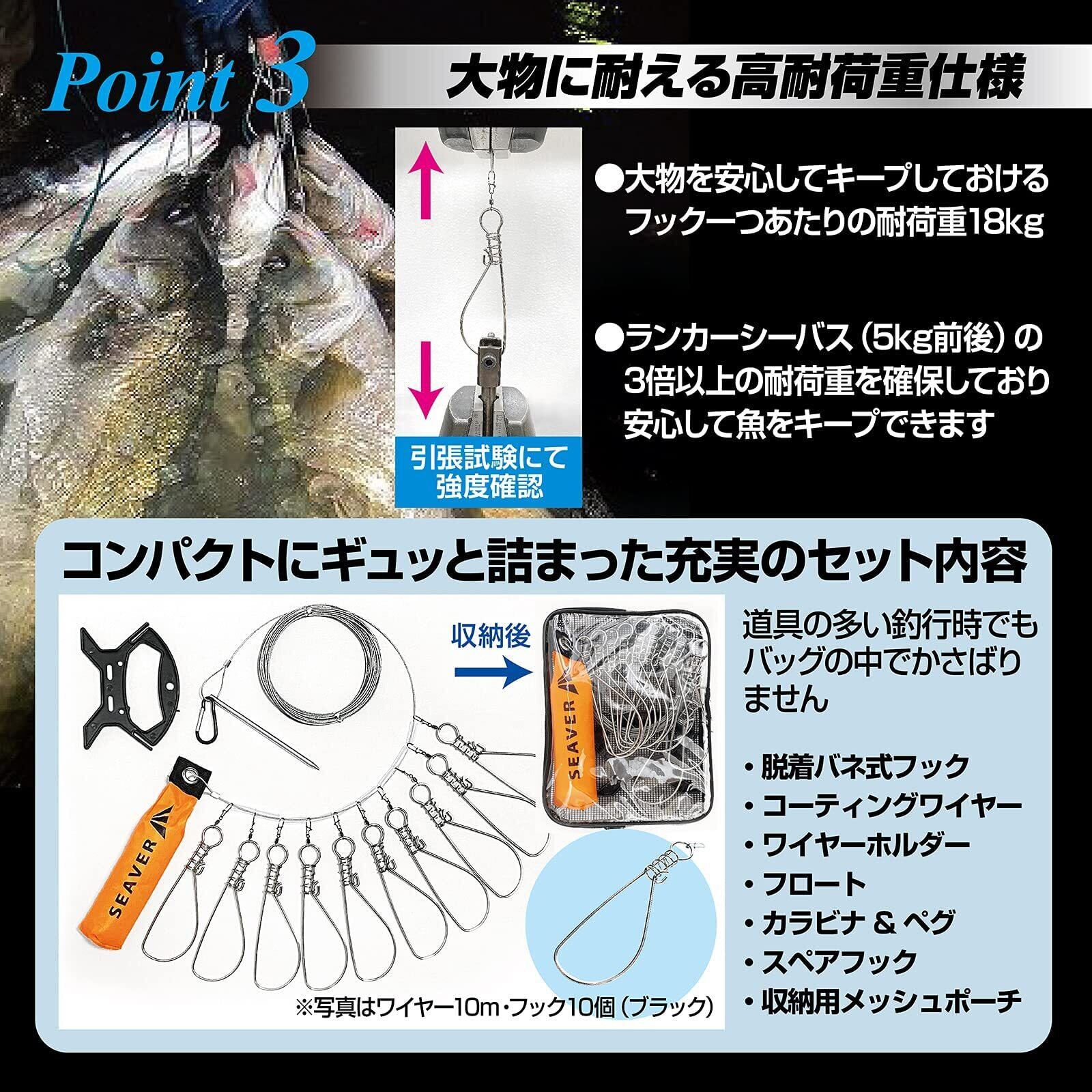 【高耐荷重仕様 】フック一つあたりランカーシーバス約5kgの3倍以上の耐荷重18kgを確保しており、安心して釣り上げた魚をキープいただけます。国内検査機関での引張試験にて耐久性を確認済み。