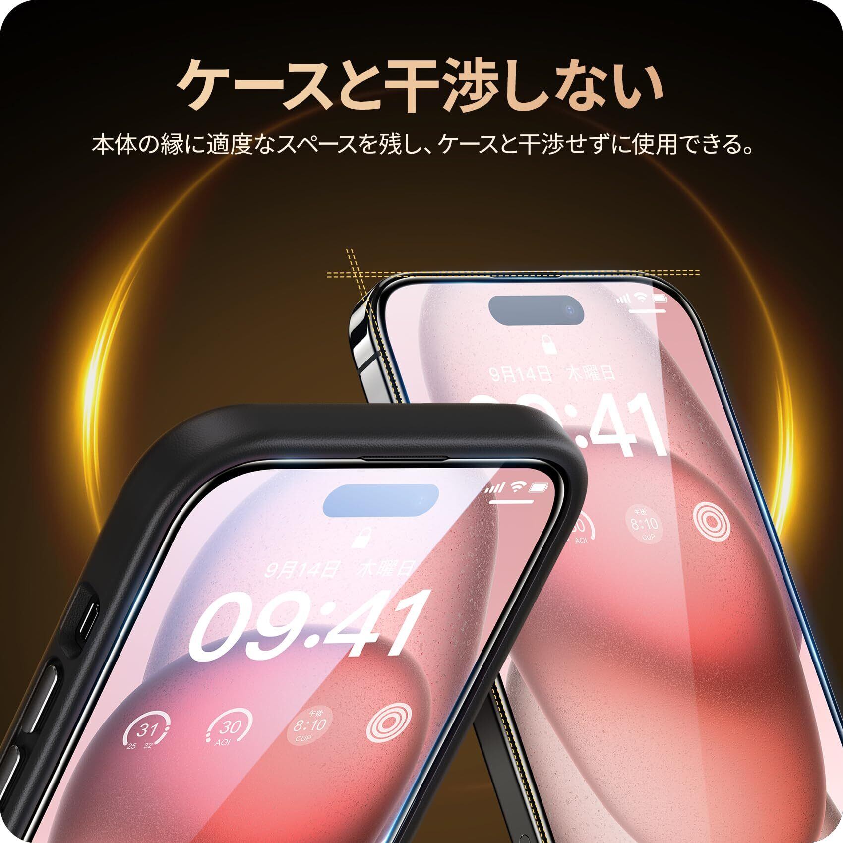 【薄型ガラス・ケースと干渉せず】厚さ0.33mmの超薄型で、透過率は99.99%。驚くほど高い透明度を誇っており、画面の鮮明さや美しさを損なわずにiPhone本来の美しい画面をお楽しみいただけます。3Dラウンドエッジ加工が施されており頑丈でありながら、引っ掛かり感がなくサイドからの衝撃を和らげ、心地よい滑らかな質感を実現しました。縁までしっかり守ります。装着後もスマートフォンのデザインを損なわず、ケースとの相性も抜群です。(ご注意:本製品のサイズは、長さ:14.48cm 幅:6.89cmです。お使いのスマホケースのサイズが正しくない場合、弊社のフィルムとの干渉問題が発生しますので、正しいサイズのケースをお選びください。)