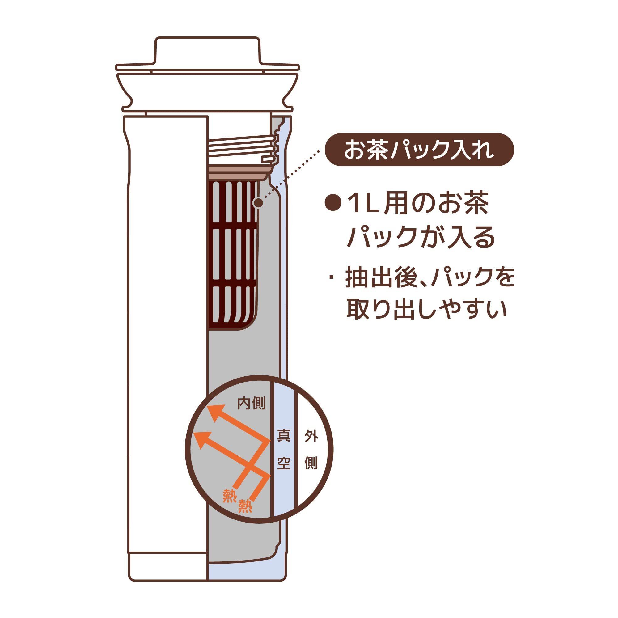 素材・材質:内びん:ステンレス鋼 / 胴部:ステンレス鋼(アクリル樹脂塗装) / フタ:ポリプロピレン(発泡ポリプロピレン内蔵) / 中せん本体、お茶パック入れ:ポリプロピレン / フタパッキン、シールパッキン:シリコーンゴム