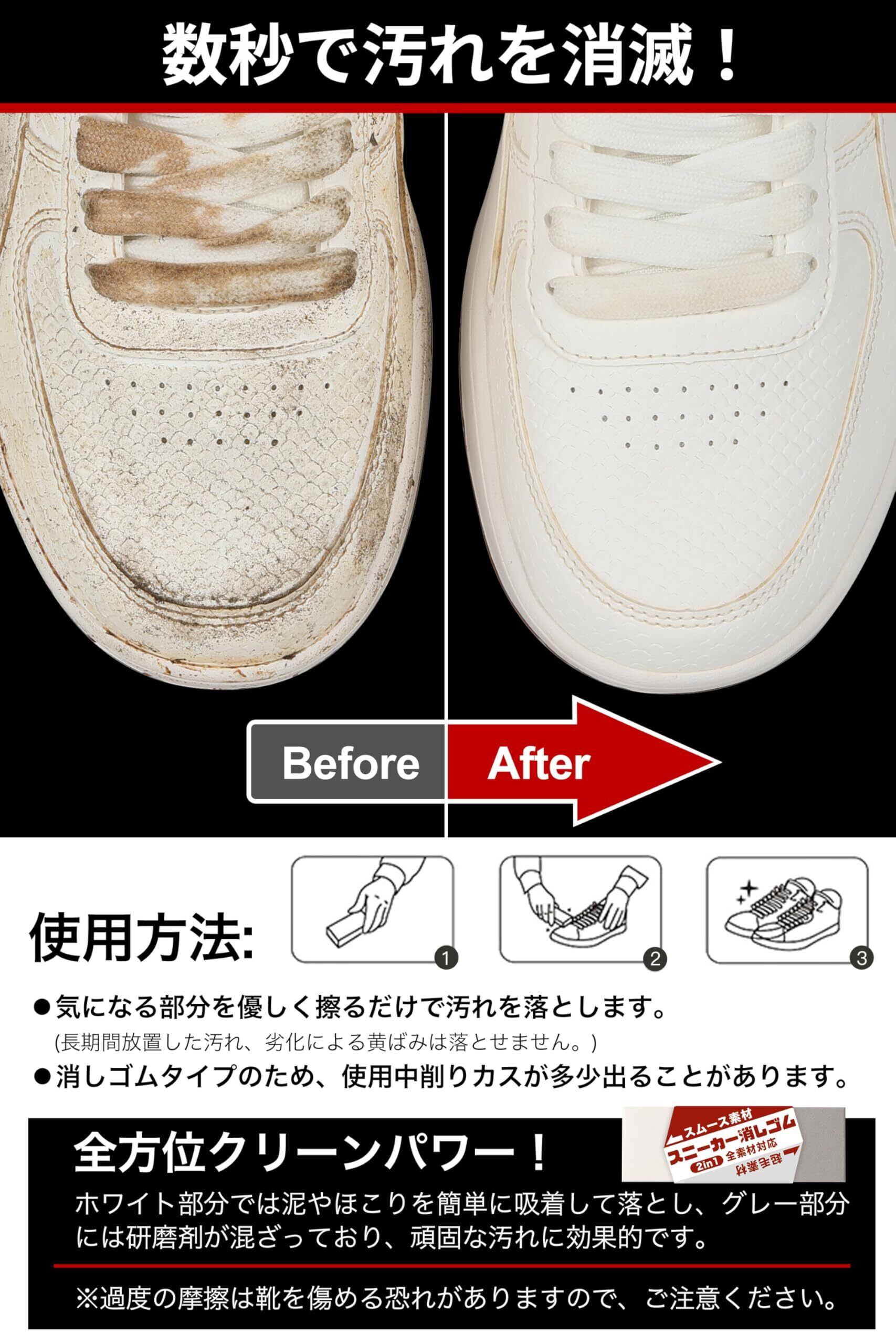 【汚れだけを落とす・スニーカーをキレイに】スニーカー専用の消しゴムを使うと、汚れだけを効果的に吸着し、すぐにキレイにします。靴に優しく、常に美しい状態を保つことができます。汚れを落とすには適度な摩擦が必要ですが、消しゴムタイプのため、削りカスがかなり出ることがあります。※長期間放置した汚れや経年劣化による黄ばみなどは落とせません