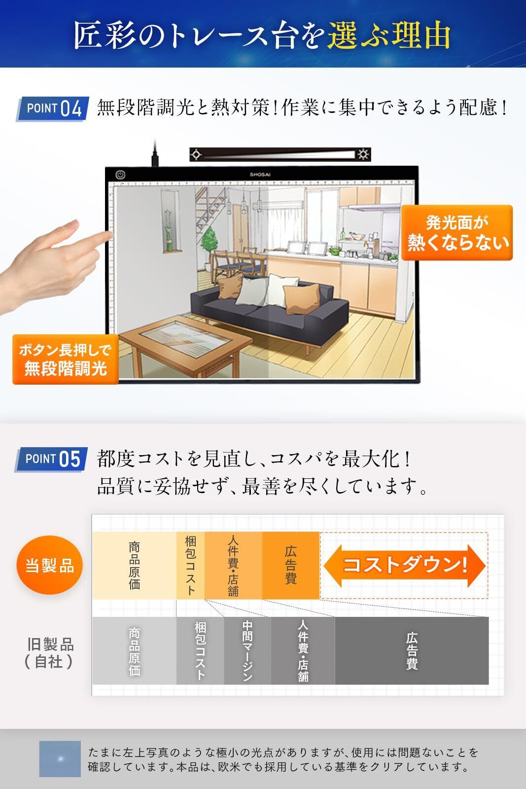【プロ推薦の高品質モデル】 LED ライト を多く搭載し 高輝度 を実現。 ドットなしの 高品質パネル による全面発光で、均等な明るさとちらつきを軽減した快適な作業環境を提供します■ボタンの長押しで 無段階調整 ができ、タッチ感度も良好ですので ストレス なく調節できます。トレース用紙の厚さに応じて明度調整するのがおすすめです。