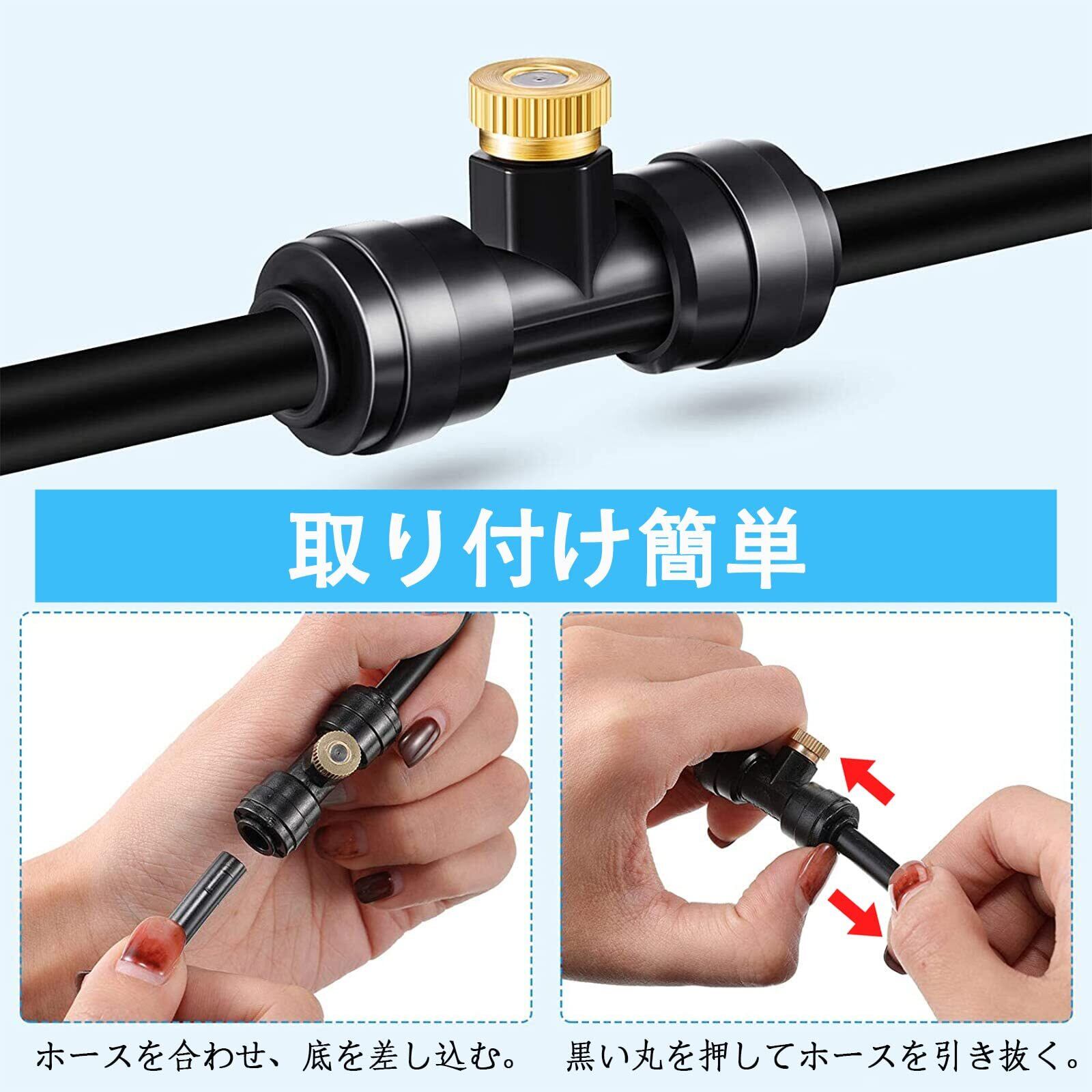 取り付け簡単:噴霧ノズルとノズルティーがそれぞれ10点ずつ含まれたセット品なので、ホースに接続して簡単にミスト装置を作ることができる。予備用のパーツを用意したりすることも可能です。