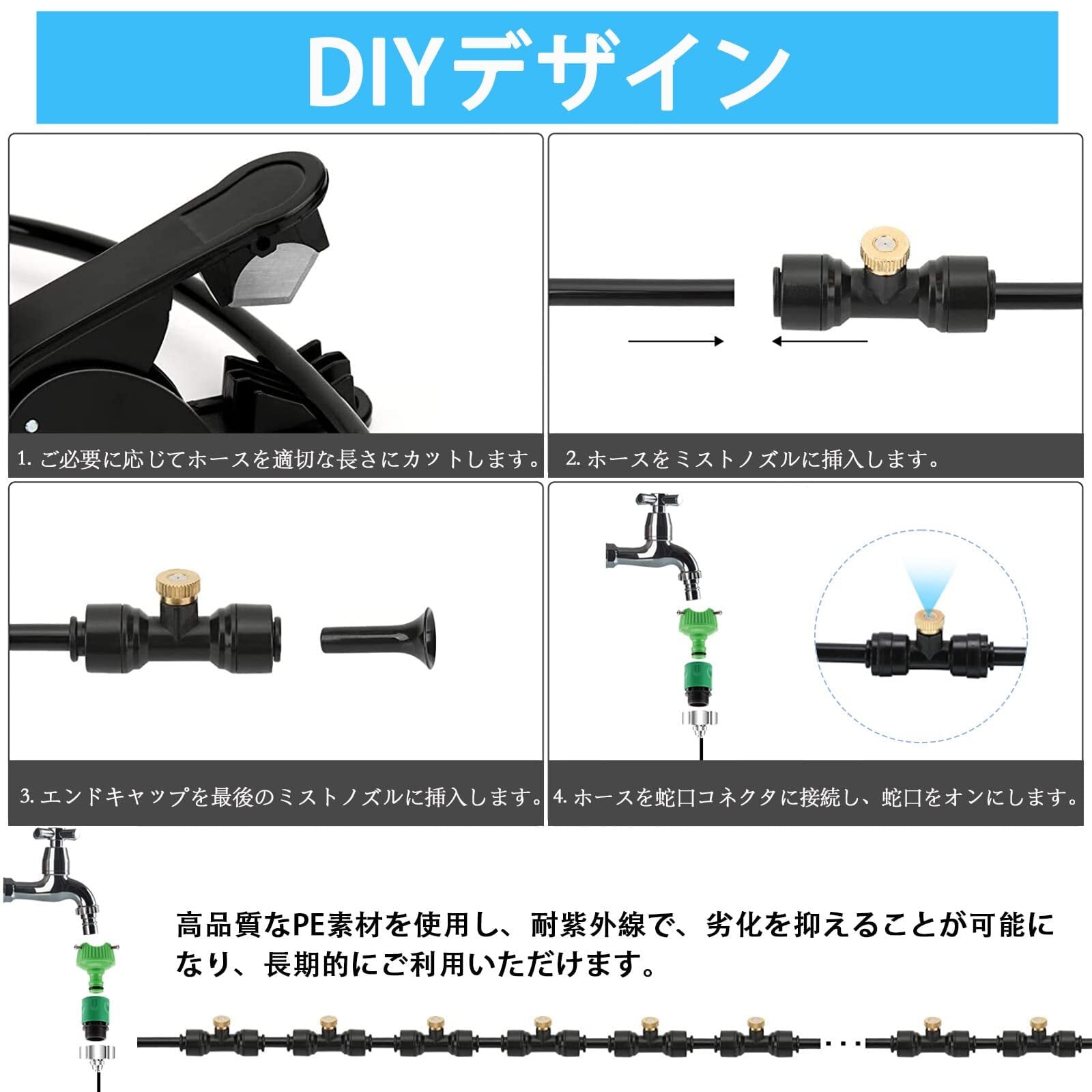 適用場合:噴霧ノズルは真鍮製となっており、きめ細かなミストを噴射することができます。屋外の冷却やビニールハウスの加湿などの用途でお使いいただけます。