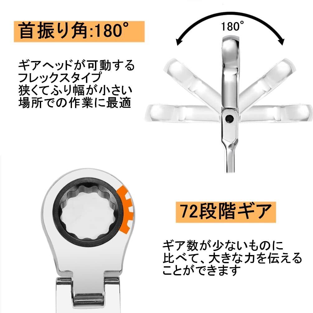 コンビネーションレンチ:一端はやり形スパナ、一端はラチェットレンチ。メガネ部は72山ギヤと12角サーフェイス採用で、ボルト・ナットの角を舐めにくくて入りやすいです。首振りタイプで0~180°角度調整できて、制限された狭い場所でも作業できますし、ボルトなども傷めません。