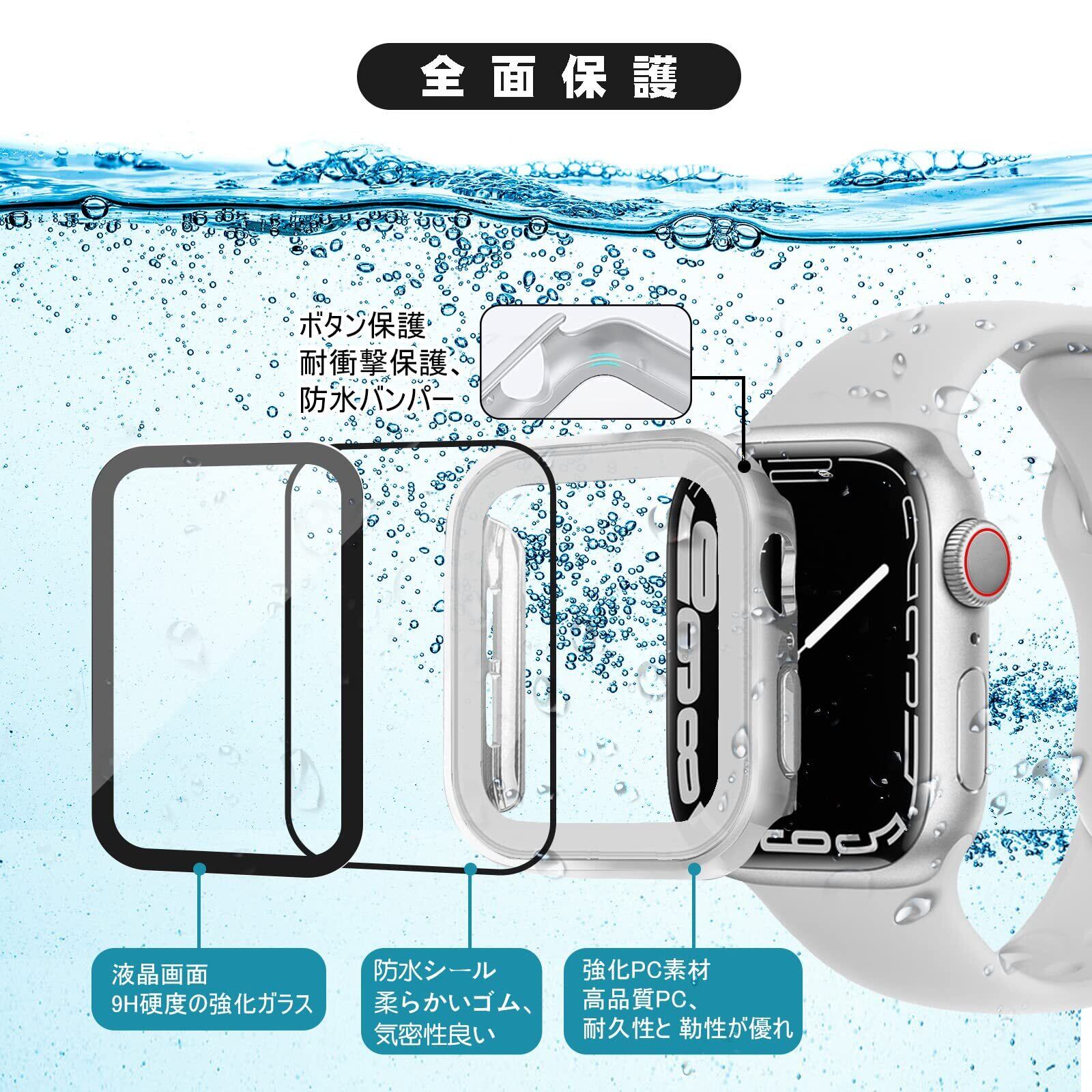 【防水・防塵ケース】シーリングリング内蔵したアップルウォッチ ケース、Apple Watchの画面にぴったりとフィットし、水の浸入を防ぎます。ほこりを完全に防ぎ、ケースを取り外して水を拭くすることを繰り返す必要はありません。疎水性撥油性抜群の強化ガラス表面により、カバー面に水が溜まらず、シャワー、手洗い、発汗、運動、雨など、日常の使用に適しています。 ※ご注意:ウォッチの画面とカバーの間に水が浸入する場合、保護カバーを取り外し、柔らかい布で水を乾かしてください。