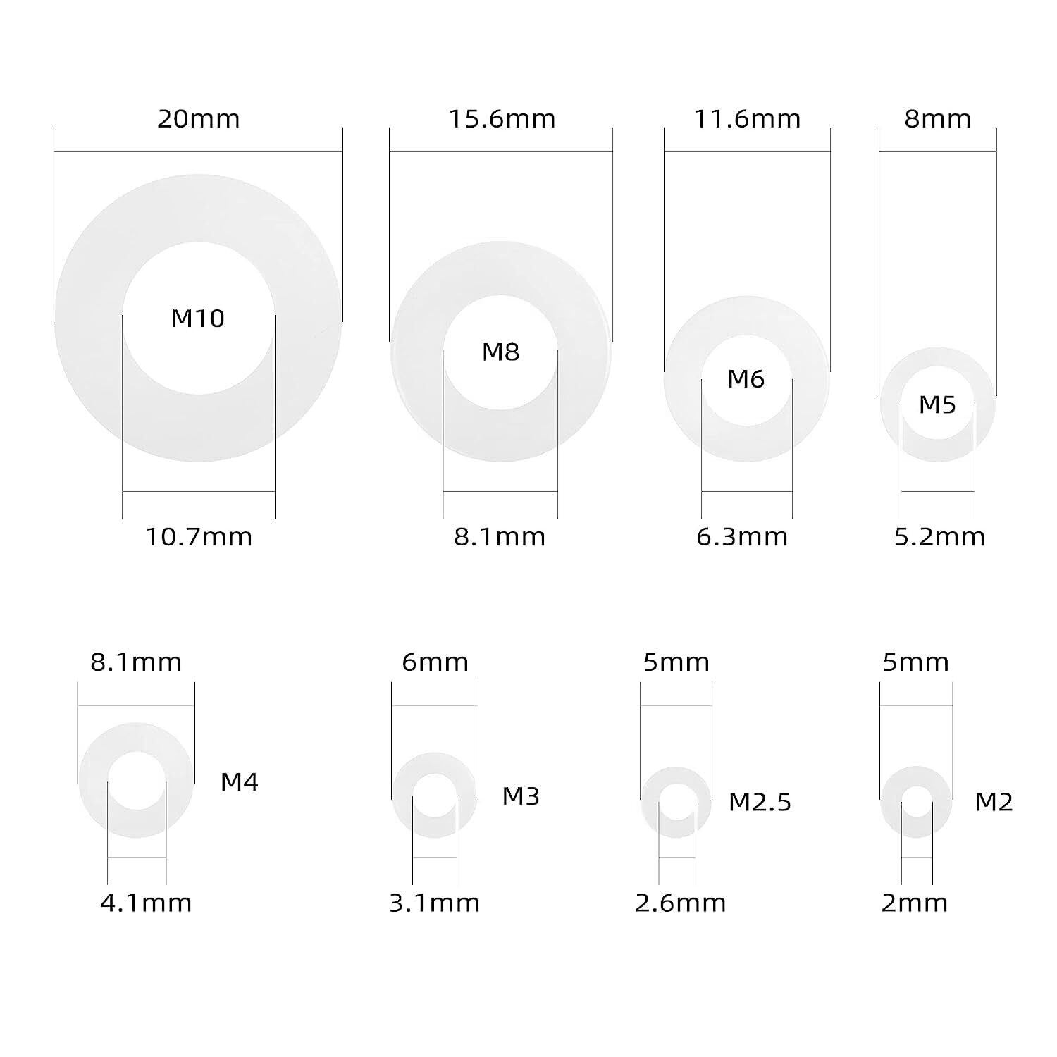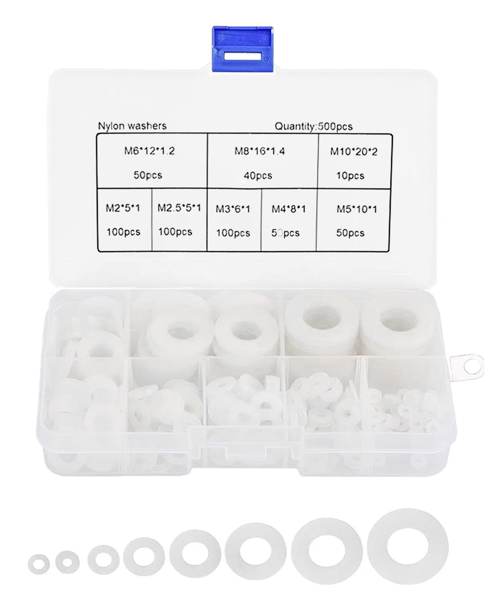 【新春セール】ナイロンフラット 500個入り フラット ワッシャー 平座金 M2~M10(M2 M2.5 M3 M4 M5 M6 M8 M10)スペーサー ナイロン絶縁 防水 平ワッシャー 補修 便利 ツール ブラック 収納ボックス付き (ホワイト)