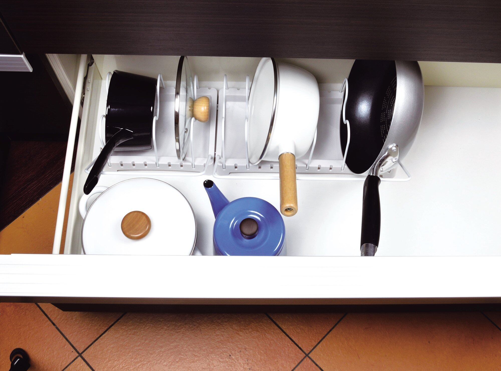 システムキッチンの引き出しの中において、鍋やフライパンをスッキリ収納