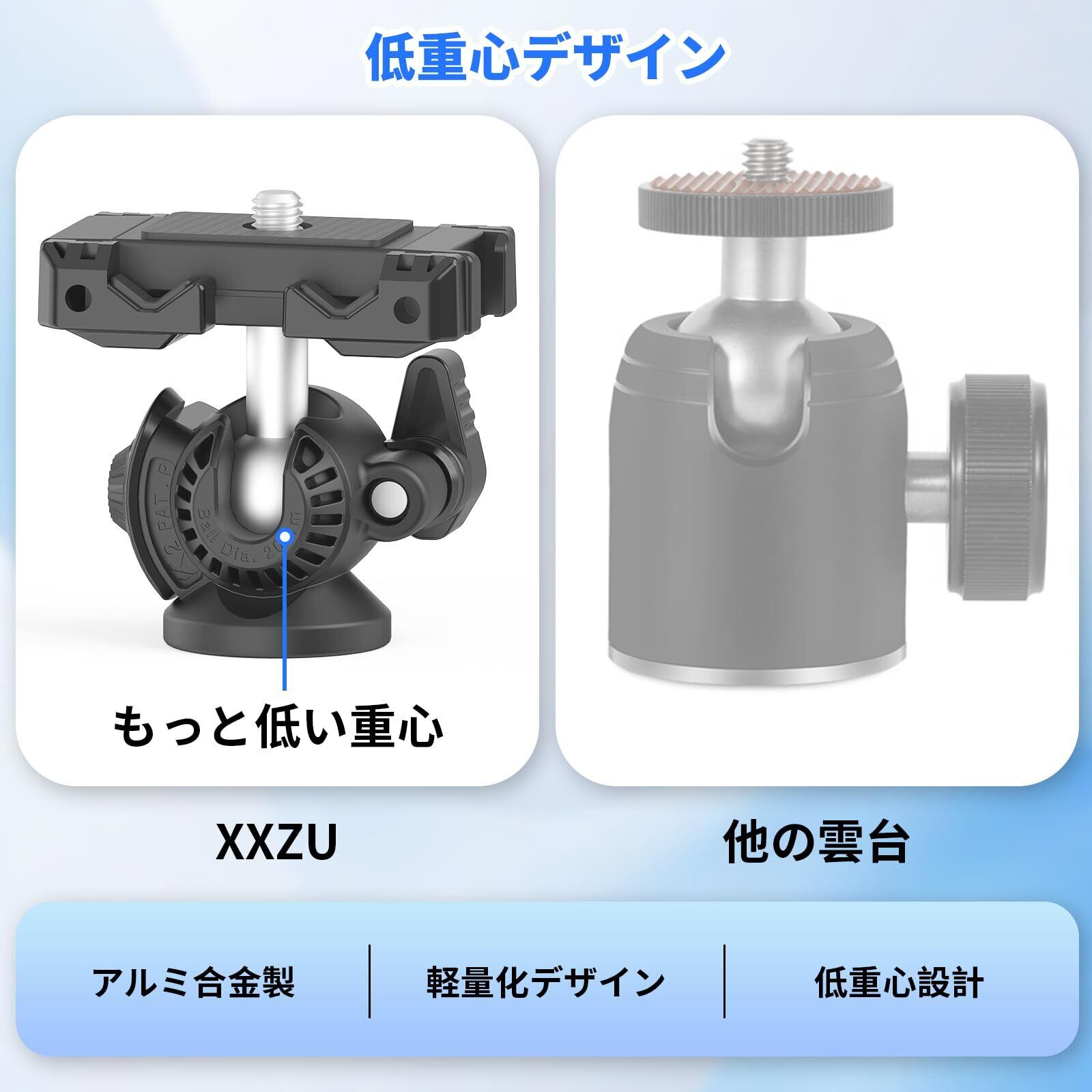360°回転ボールヘッド雲台: XXZU 三脚用雲台は水平・垂直両方向での360°回転するだけでなく、前後90°の角度調整機能も装備されており、大きな視野角が実現でき、パノラマ撮影に最適です。素晴らしいパノラマ写真やビデオを撮影する体験を楽しめます。サイドのノブを締めることで、お好みの位置に固定することができます。
