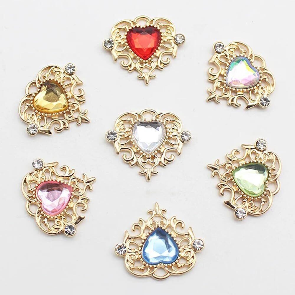 【ジェムストーンデザイン】このハート型ダイヤモンド装飾アクセサリーには、16色の樹脂クリスタルと浅金色合金の台座があり、サイズは21×25mmです。多面カット技術でカットされたダイヤモンドは、宝石のような質感で、光を反射して輝きます。この美しいデザインは、DIYプロジェクトにエレガントな質感を追加できます。