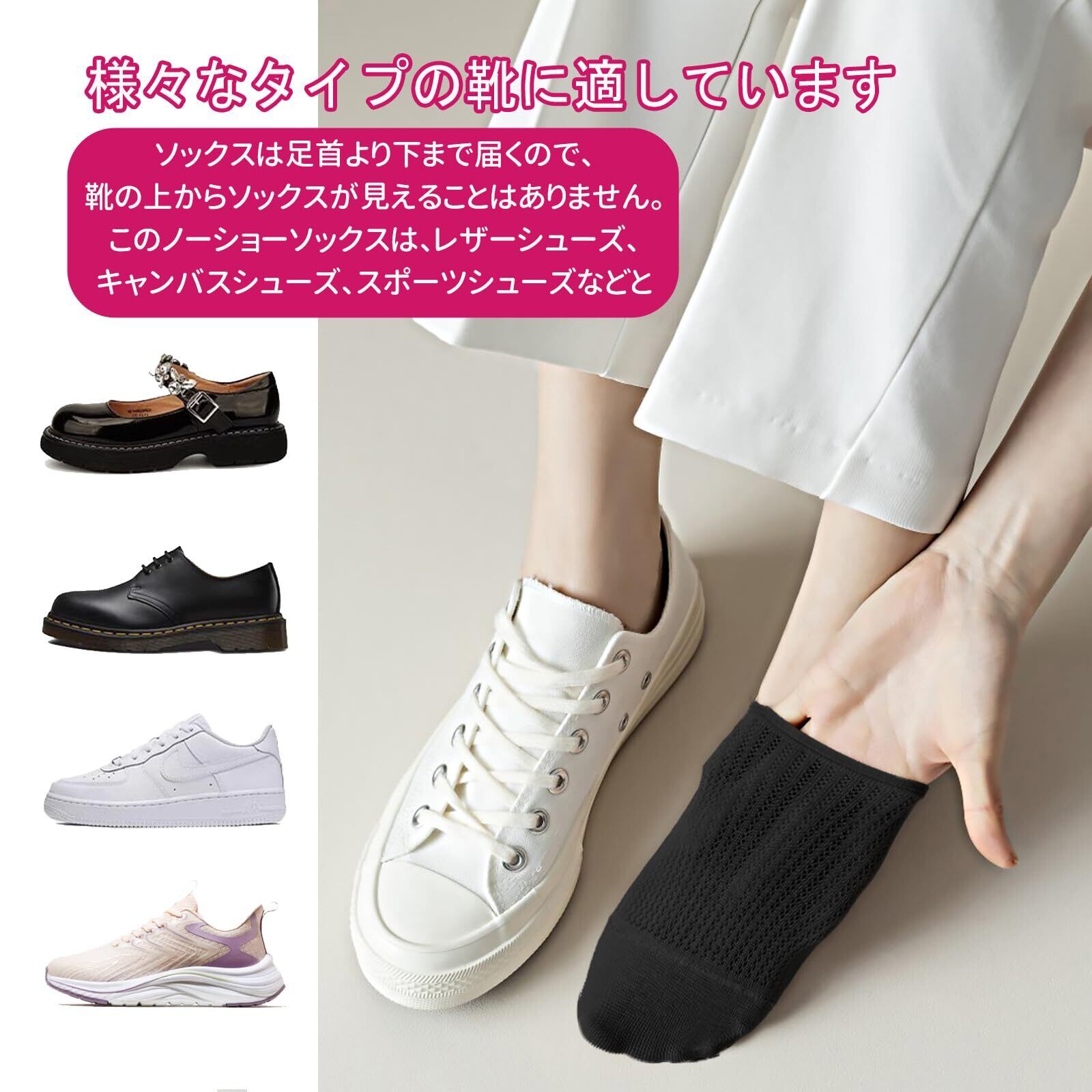 靴下を隠す: レディース ソックスは足首より下まで届くので、靴の上からソックスが見えることはありません。このノーショーソックスは、スニーカー、カジュアルシューズ、キャンバスシューズ、レザーシューズ、スポーツシューズなどと合わせて履く女性に最適です。