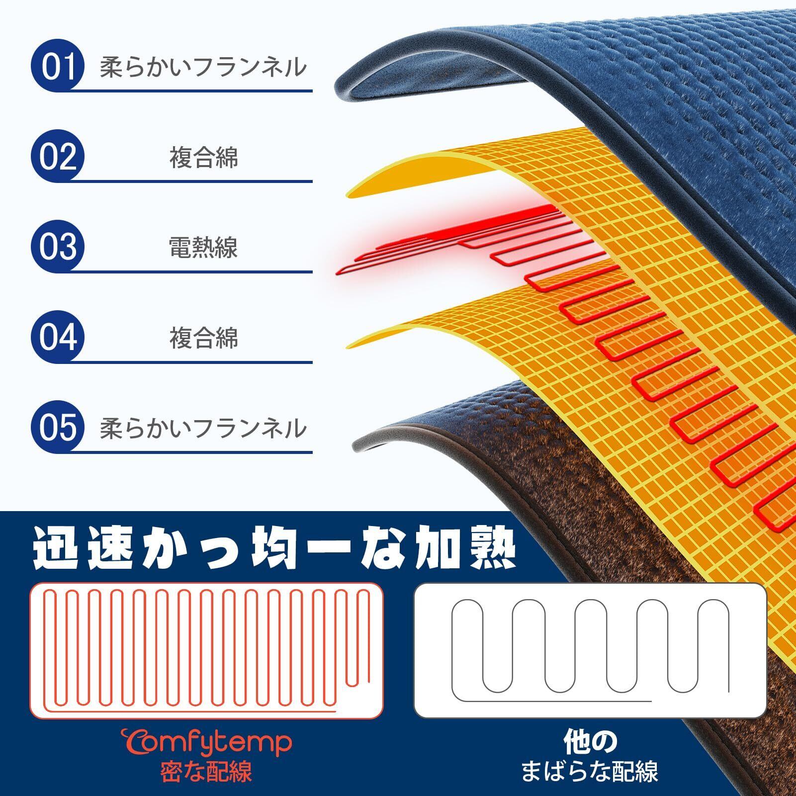 【過熱防止、過電圧保護】Comfytemp電気マットは、安全性を高めるため、伝統的な単層発熱線をPTC/NTC発熱線にアップグレード。この設計で均一な熱分布がされ、過熱のリスクが低減。この設計により、電圧が異常な場合には自動的に電源が切れ、熱が均一に分散されて調整され、過熱のリスクが軽減されます。