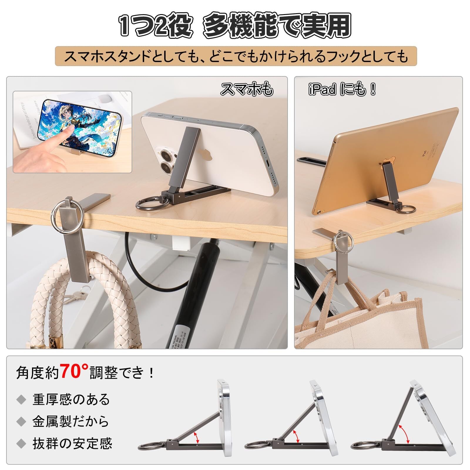 【 スマホスタンド機能付き!一つ二役 】スマホ、タブレットなどの動画視聴、ゴルフのフォームチェック、写真撮影・自撮り等のシーンで利用できるスマホスタンド機能付きバッグハンガー、カバン掛けです。70°以内好きな角度が自由に調節可能。安定感があり、立てかけたままでも操作可能!【パッケージ内容】フック*1、カラビナ*1。