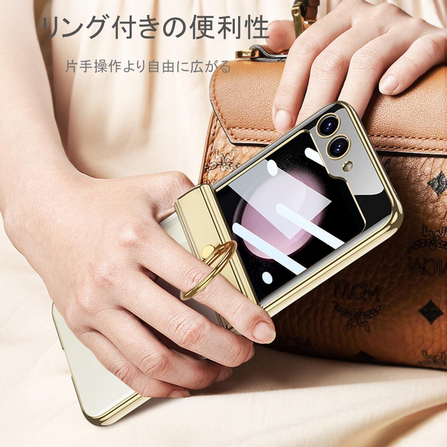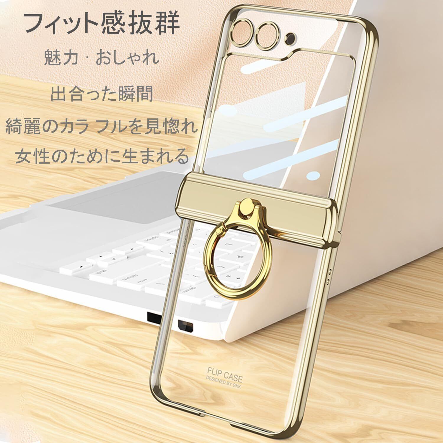 Galaxy Z Flip5 クリア ケース ヒンジ保護 Samsung ギャラクシーZ フリップ5 用 カバー リング付き スタンド機能 Uovon スマホケース 背面に保護フィルム付き ストラップ穴付き メッキ 超軽量 超薄型 おしゃれ · ゴールド