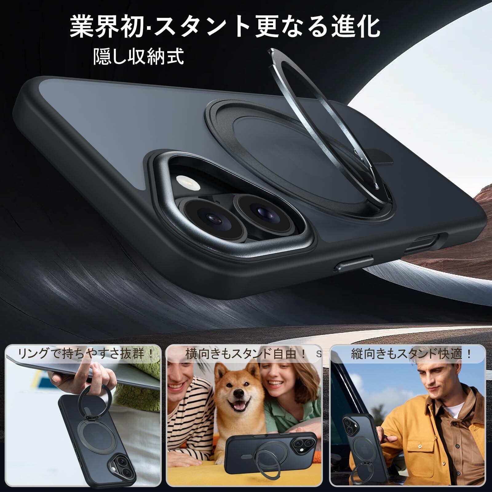 iPhone 16 Plus 適用 ケース Magsafe対応 アイフォン16プラス カバー 360°回転スタンド Uovon スマホケース アイホン 16plus 携帯ケース ワイヤレス充電 車載ホルダー 対応 ストラップ穴付き 半透明 指紋防止 黄变防止 ・ ブラック