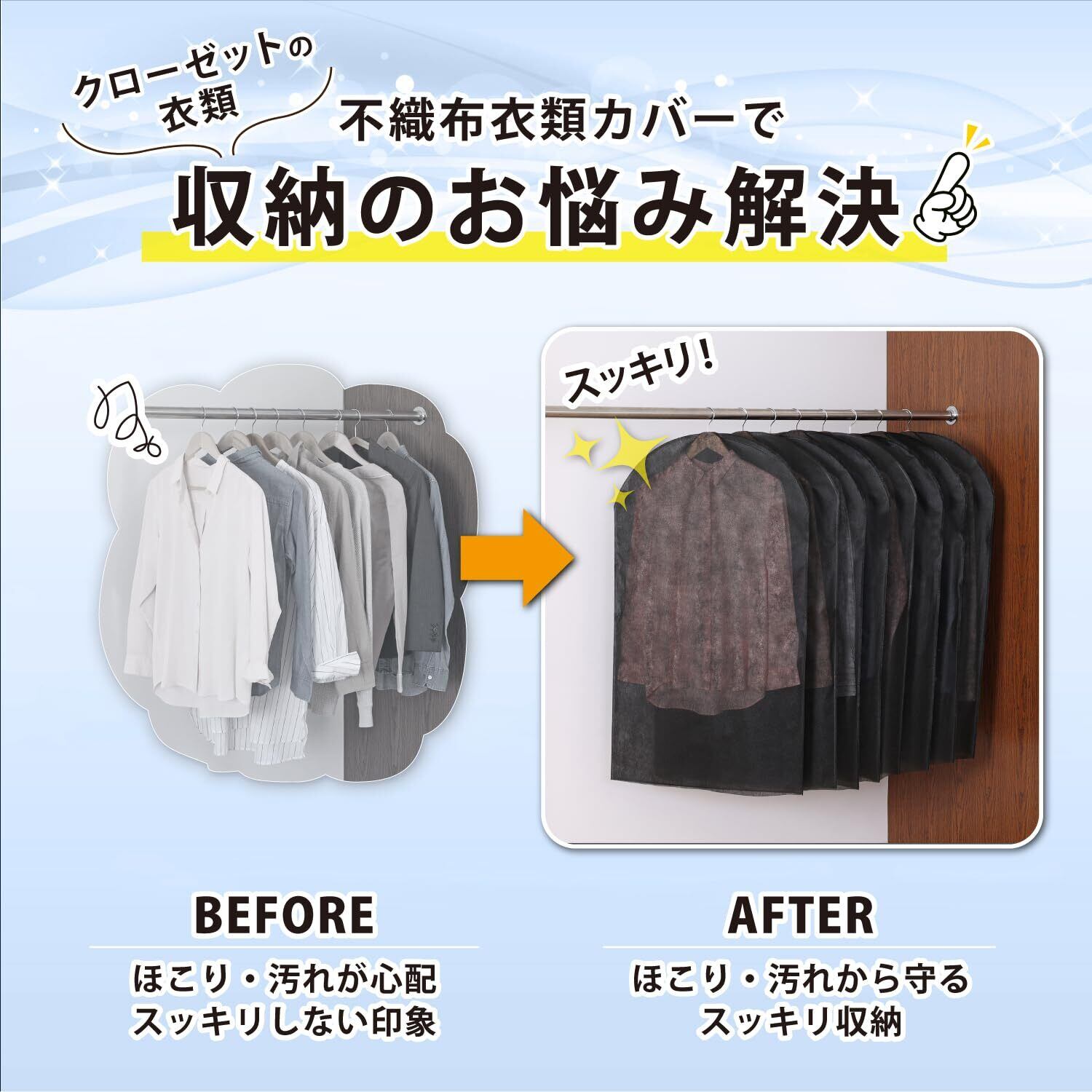 【通気性の良い不織布の衣類カバーで埃を防ぐ】:通気性が良く湿気やにおいのこもりにくい不織布製の衣類カバー。オフシーズンの衣類のほこり除けに。