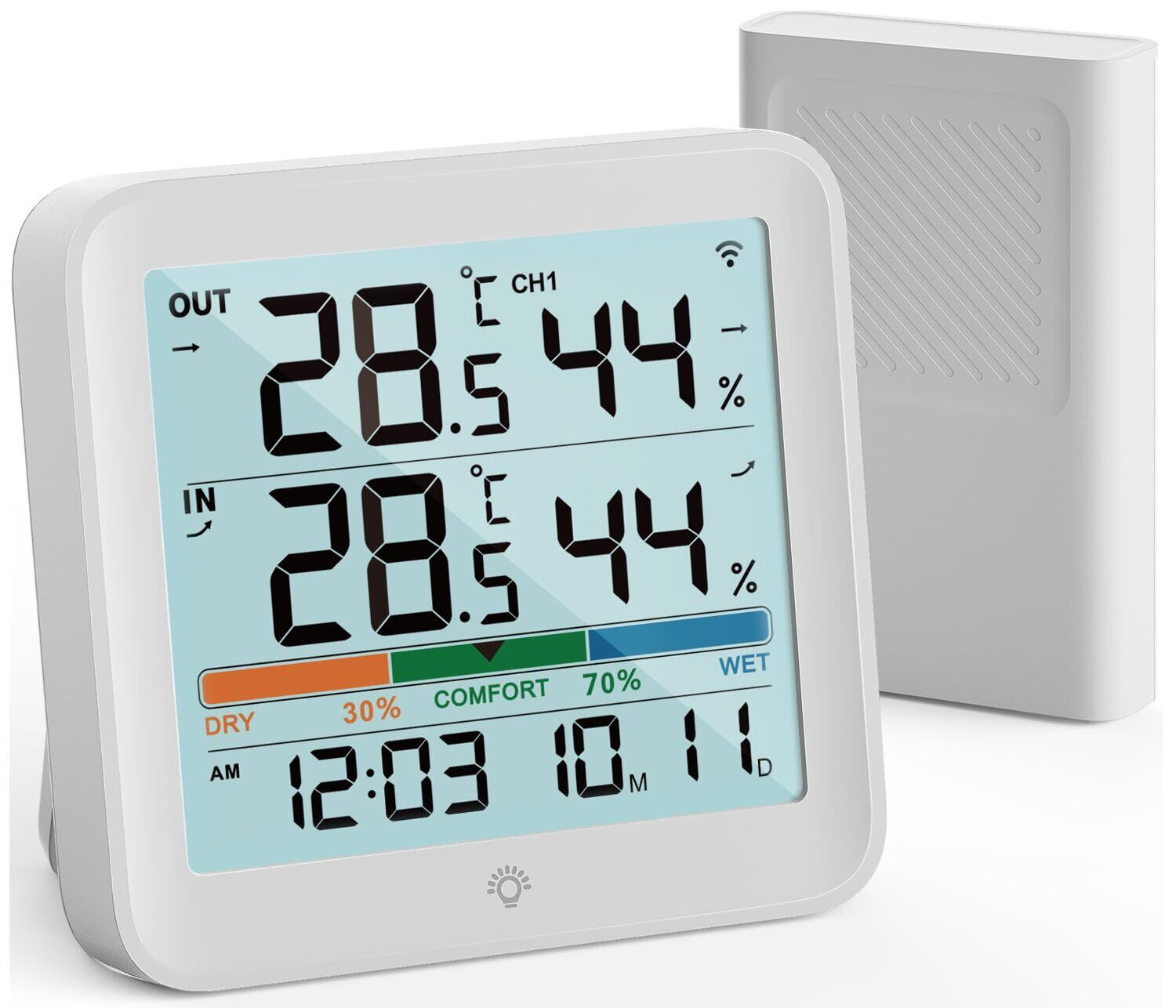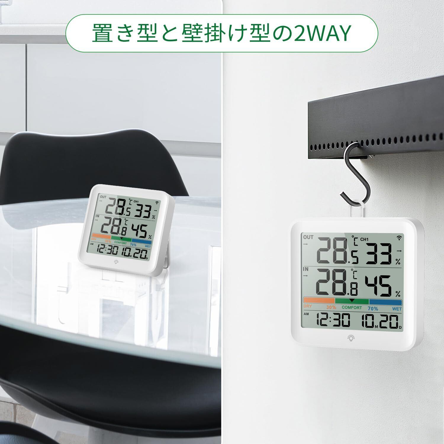 【リッチでわかりやすいデザイン】屋内外温湿度計、空気快適性インジケーター付き(3色)、12/24時間計、月-日表示、温度と湿度の矢印トレンド、低バッテリーアイコン、℃/℉切替機能。
