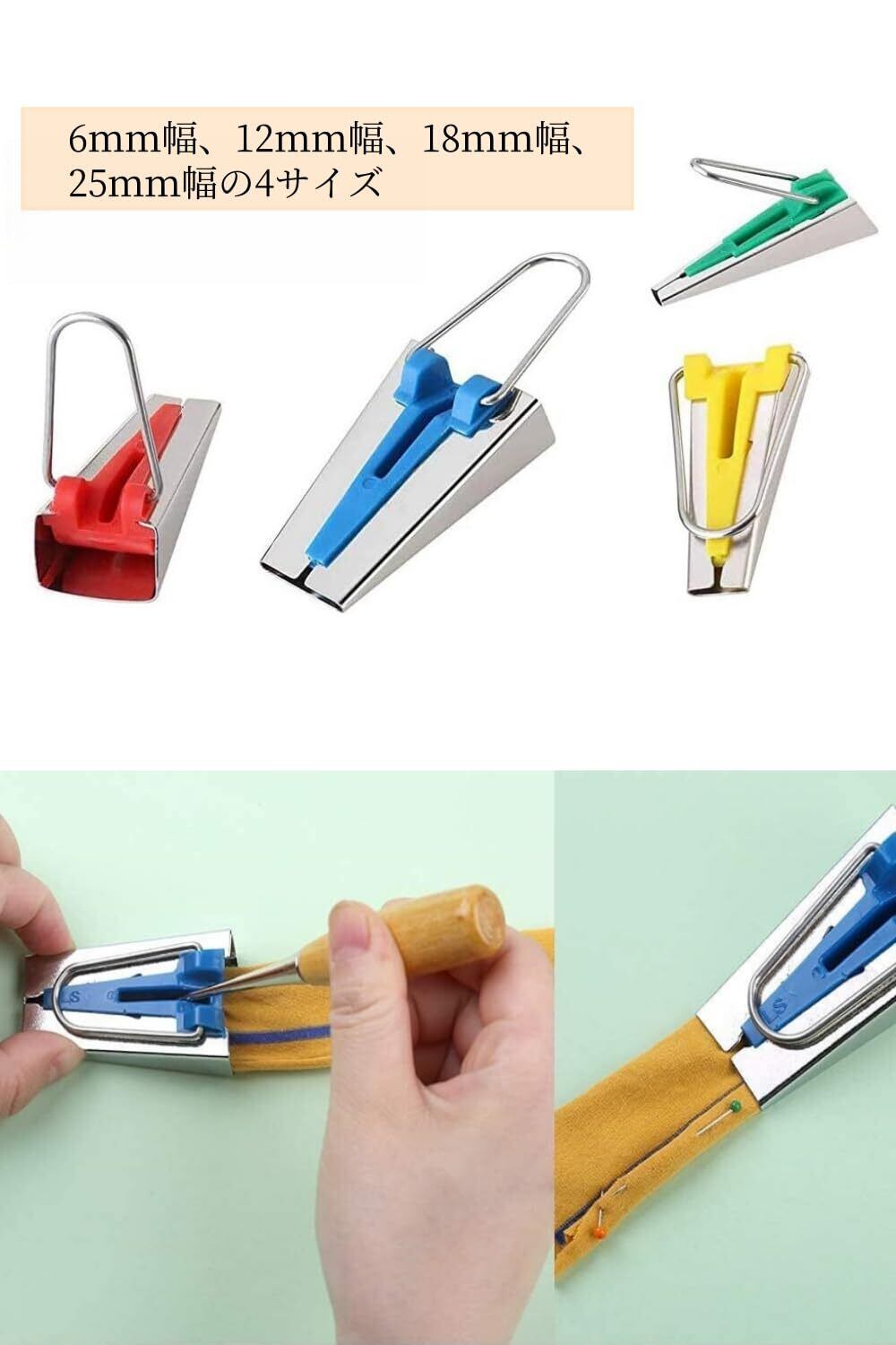 【商品仕様】カラーバイアステープ(4サイズ:6mm 12mm 18mm 25mm )、Awl、ボールポイントピン、可変バイアスバインダーフット。
