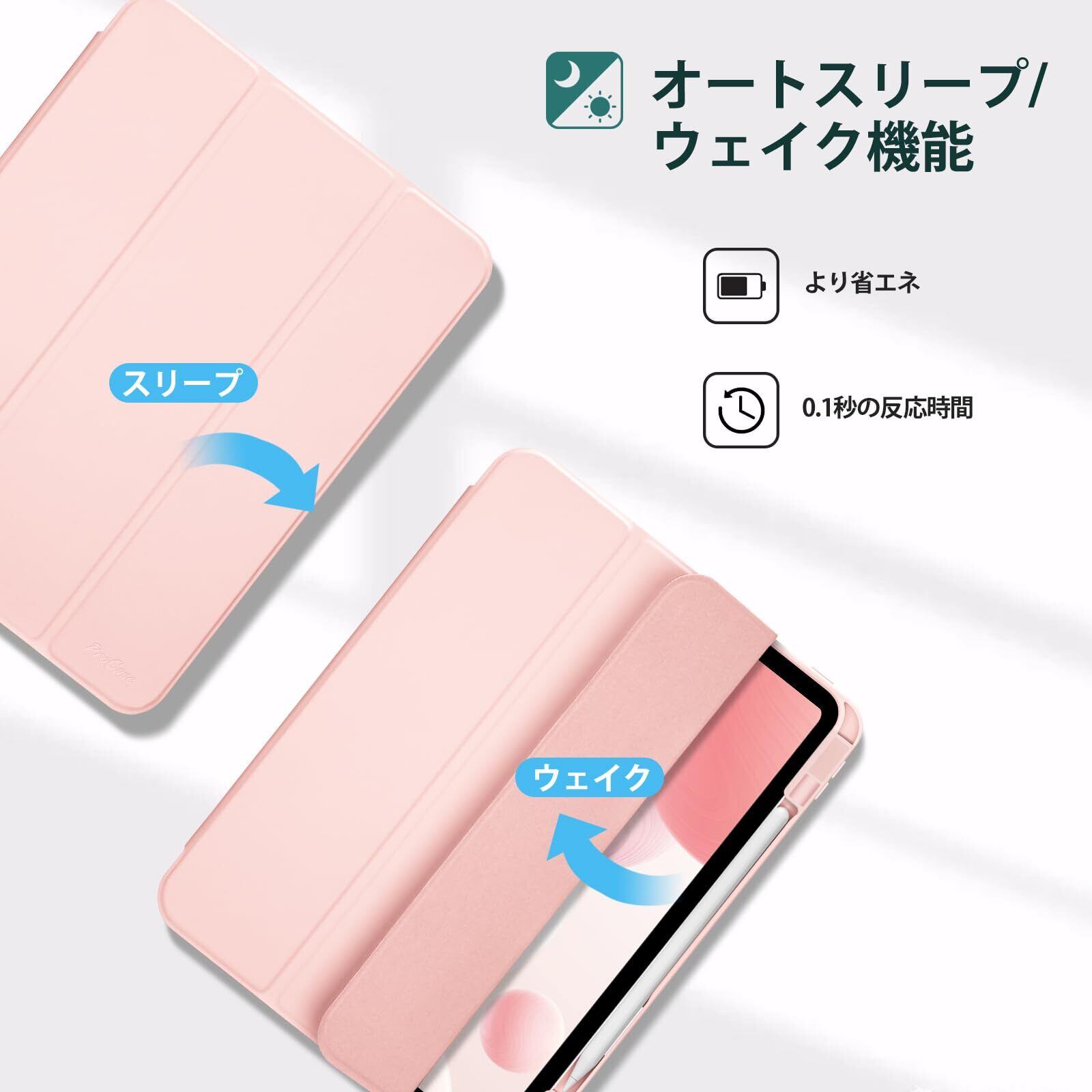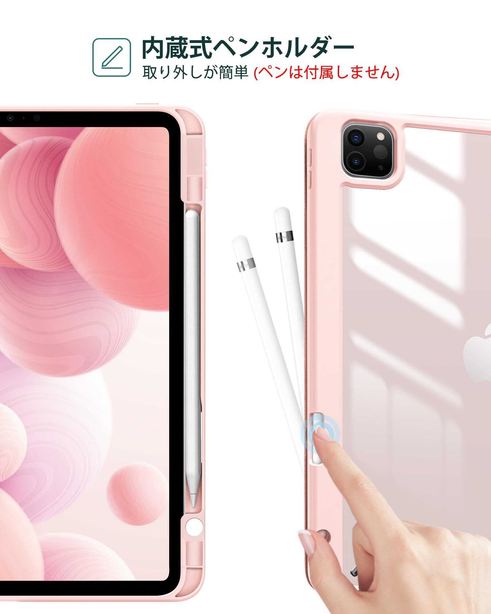 ProCase iPad Pro 12.9 ケース 第6/5/4/3世代に適用(2022 2021 2020 2018) 透明 クリアバックカバー ペン収納 耐衝撃 三つ折り スタンド スマートカバー - ピンク