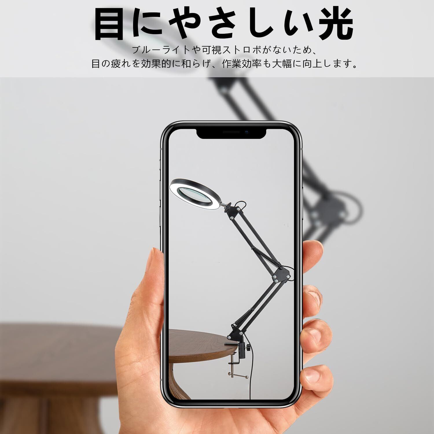 【ライト付き拡大鏡】360°自由に角度を調整できる置き型&クリップ式両用のライト付き ルーペ。両手を解放して、読書、写真、自撮り、新聞を読む、プラモデルを作る、ネイルの手入れなどの細かい作業にも最適です。そのまま置いてもいいですし、机の縁に挟んでもいいです。