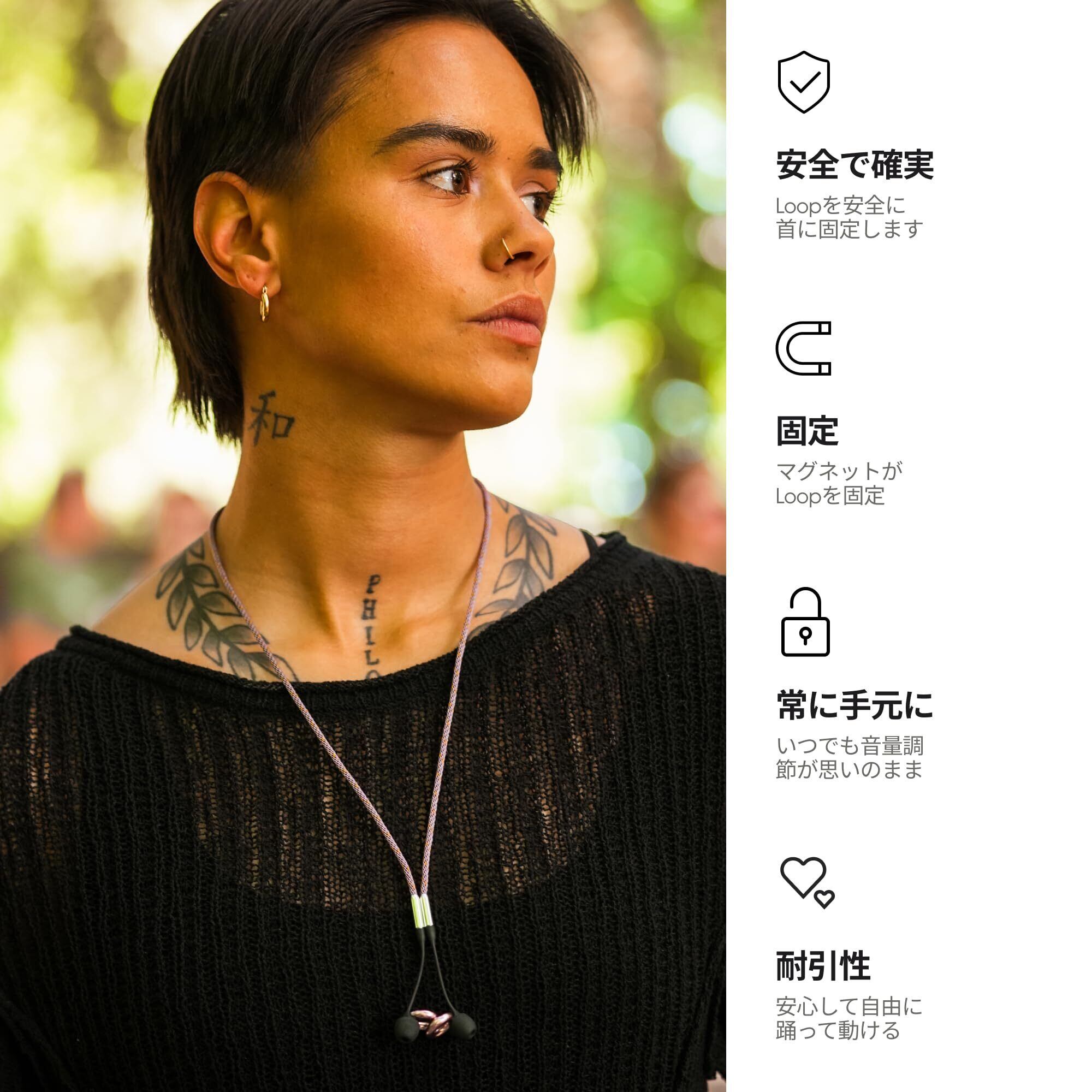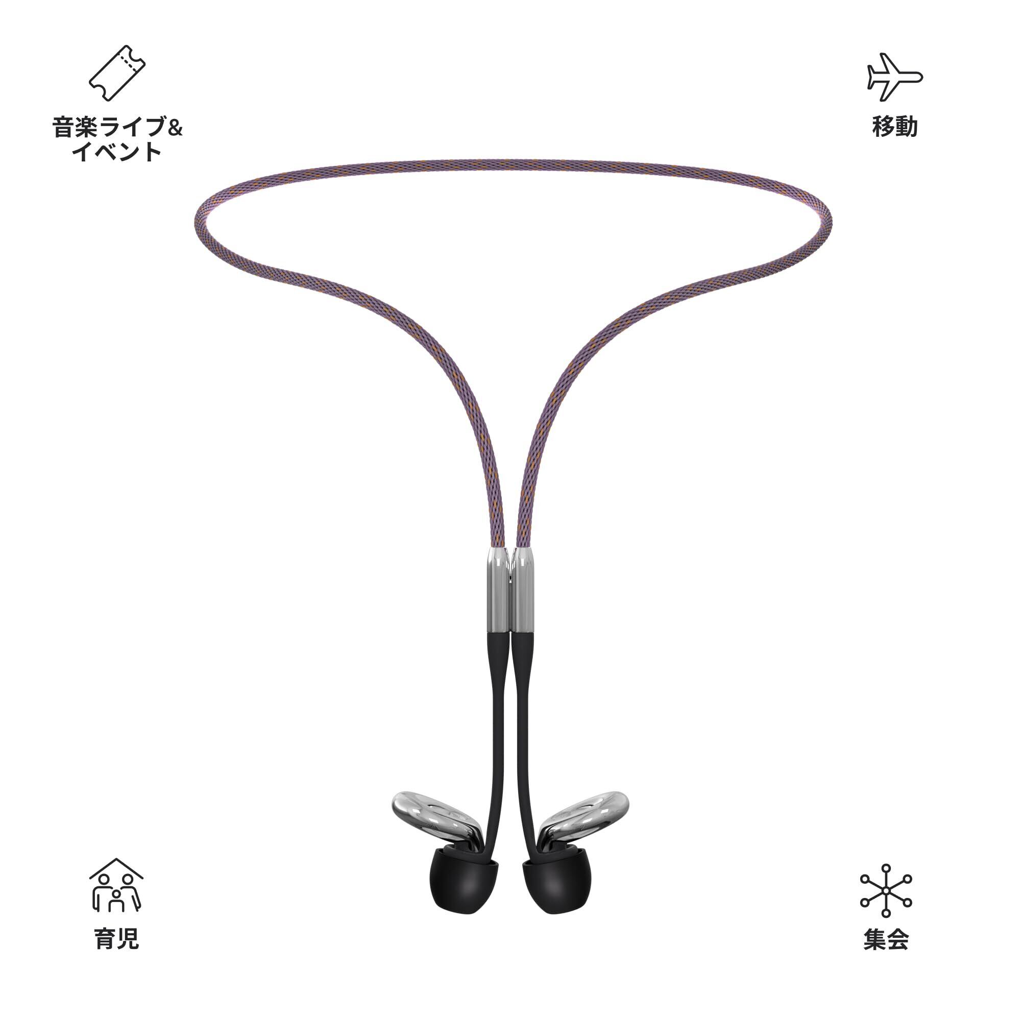 耳栓を素早く装着 – Loop耳栓を安全に保つだけでなく、Loop Linkで常に耳栓を身に付け、素早く装着。Loopを首から掛けておくことで、バッグの中を探し回ることなく数秒でLoopを耳に挿入できます。
