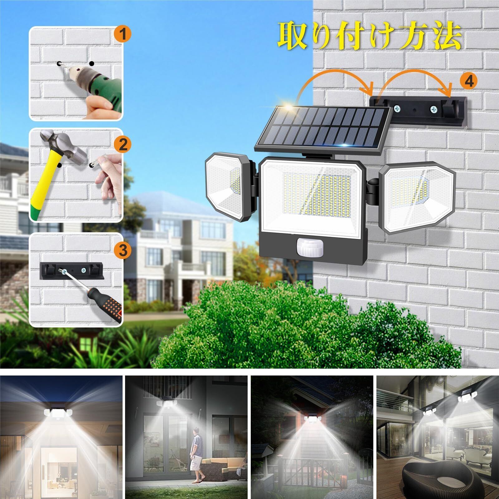 【新発売高輝度440LED&照明角度調整可能】従来のソーラーライトを基础として、ソーラーパネル、LEDチップ、バッテリー、光電変換率、明るさ、外観など全面的なアップグレードを行った。440個高輝度2835型LEDライト、高通過率ランプシェードを採用し、光源均一、昼光色6500K、光束3000ルーメン、照明性能ばっちり!ソーラーパネルと両側のライトを独立に回すことができるので、角度の調節がしやすい、ソーラーパネルを上下50°調整し、サイドのライトを前後90°調整し、上下に300°回転できます。サイドのライトが好きな向きに調整ができて照明角度が300°ほどに達し、照明の範囲も広く。