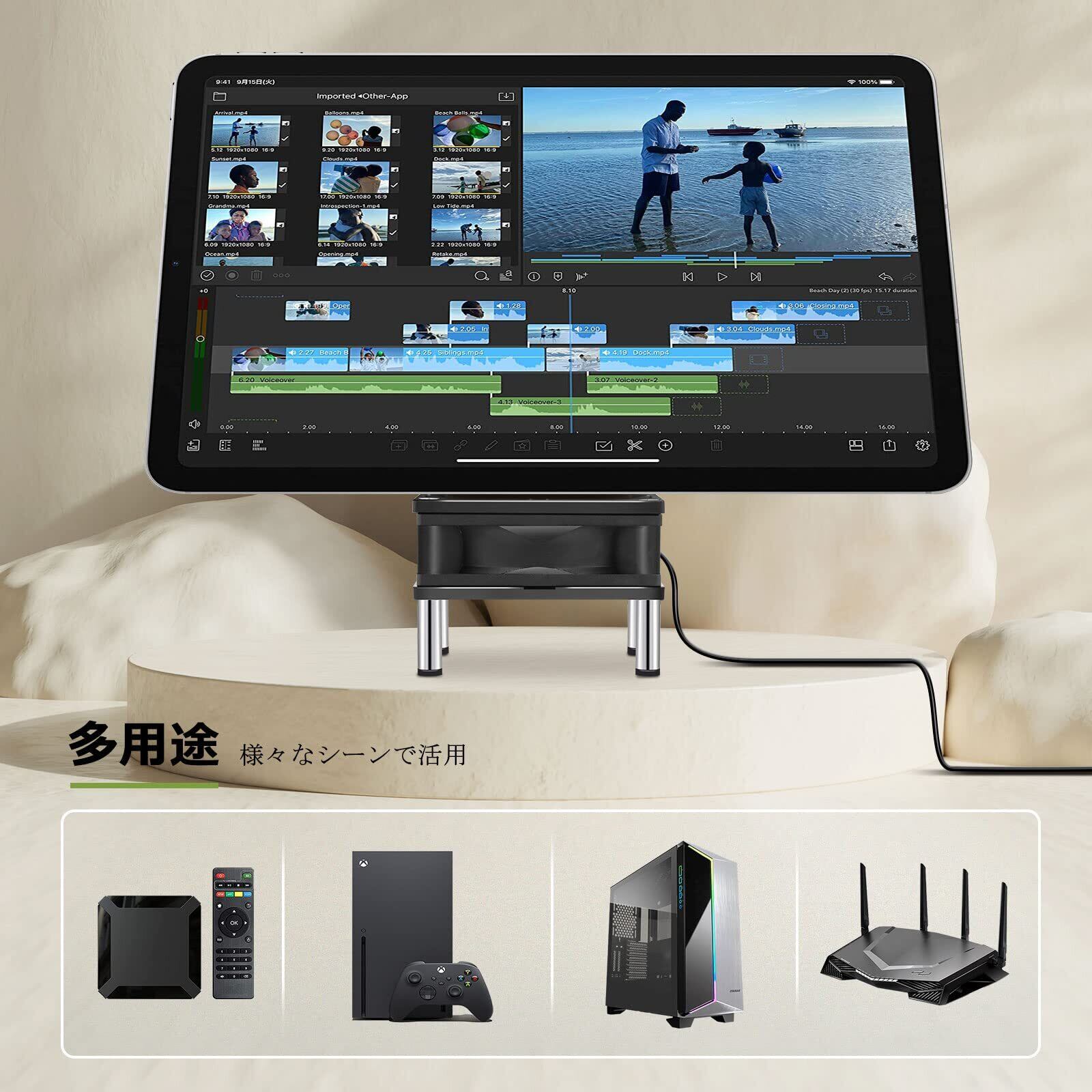 電子端末をUSB 冷却ファンに乗せて、風が下部から端末に当てるように冷却させます。空気の流れ又は熱気の排出を加速し、熱こもり現象を防ぐことができます。