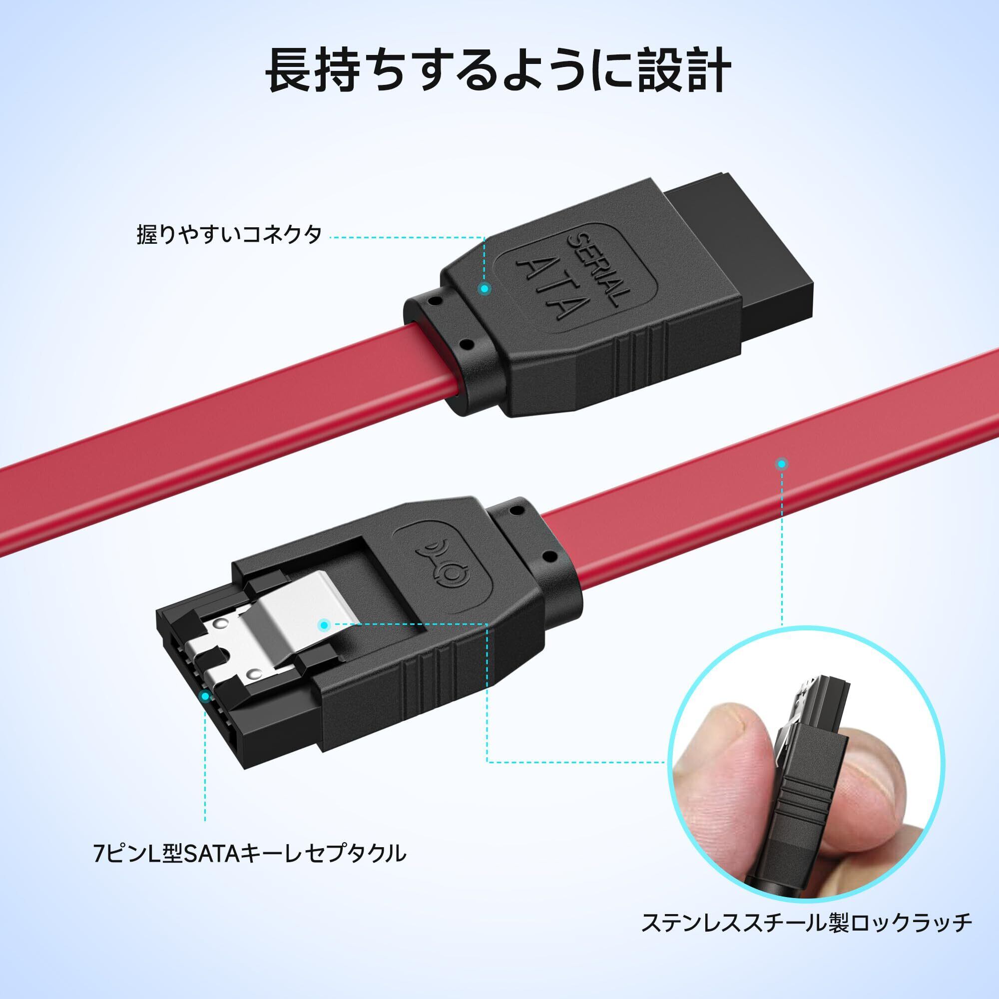 【人間工学のデザイン】SATAケーブルはマザーボード、ホストコントローラーとSATA対応ハードディスクドライブなどを接続するために設計されます。ソフトSataケーブルがフレキシブルなジャケットが採用され、取り回しに便利;両コネクタラッチ付きでケーブルをしっかり固定可能;識別に便利なブライトセリーズ色のSATAケーブルは接続機器を簡単に見分け可能です。